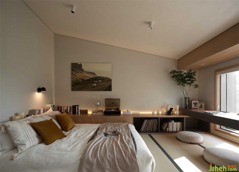 Stepping into the sunken master bedroom, the gentle breeze lifts the curtains, just level with the courtyard view. Continuing the design concept of the living room, the TV background wall of the master bedroom is replaced by the vibrant inner courtyard.