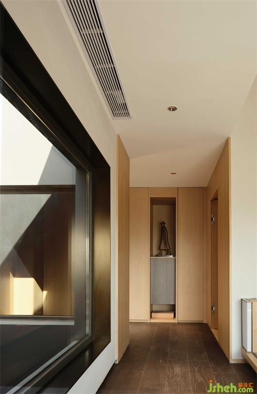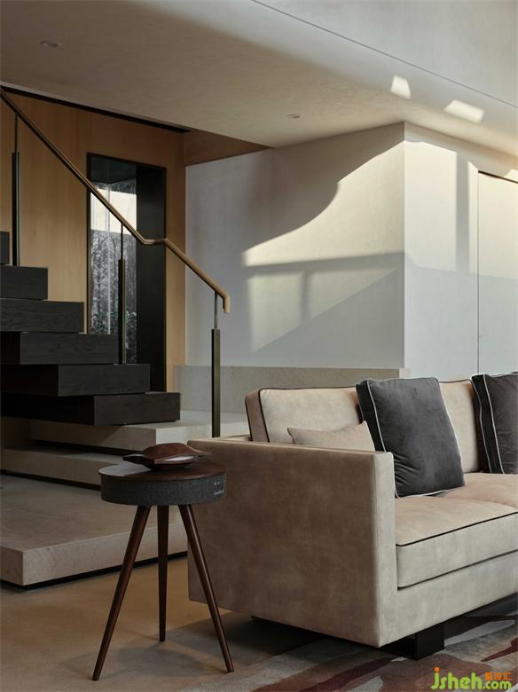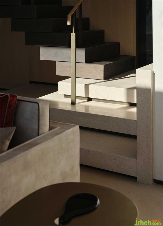 万科样板房设计会客厅后的楼梯向上延展,由温润的大理石踏面转为质朴的木饰面,行进之间叠级变化。