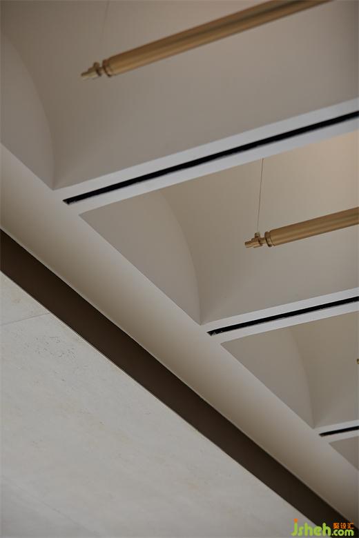 在一旁的沙盘区,销售中心设计精心将所有光线设置成漫反射,以均质化的泛光形态弥散在整个区域,让自由而柔和的氛围感笼罩当下,引导访客静心观赏与探索。在细节处,极富结构感的灯带以铜管的样式嵌入空间中,满足照明需求的同时更可提升细微处的精致度。