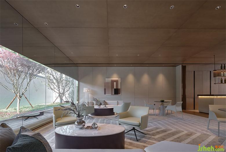 浅绿色的搭配与墙面亚克力的补色奠定了舒适而轻松的调性,点缀了年轻化的空间质感。销售中心设计不同区域之间的软性分割让整体隔而不断,通透性与安定感并存,仿佛是当人走进轻奢酒店的大堂空间,尽可停下脚步与友人小酌谈心;窗外的野意景色近在咫尺,外界的生机盎然也衬托着室内的朝气与活力。
