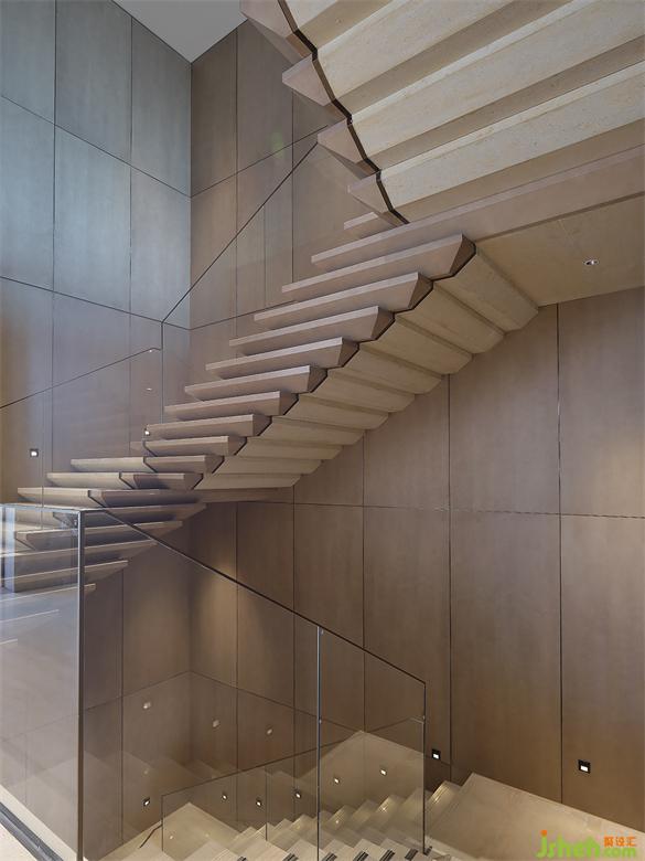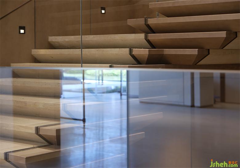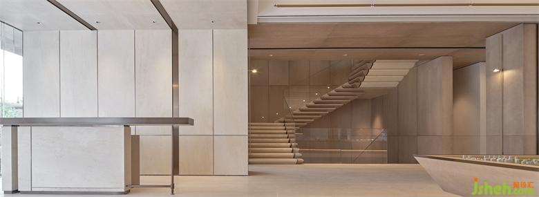 木色系的楼梯有着极强的雕塑感,它既是重要的垂直交通,也是空间的视觉中心点;销售中心设计转角的弧形倒角处理让其更柔和,触手生温的木质表面让人感到温暖。不仅此处,空间中多处出现的类砂岩大理石也借鉴了自然界中的元素,设计希望尽可能接近原型粗粝的质感,将自然邀请至室内,与人互动。