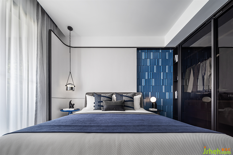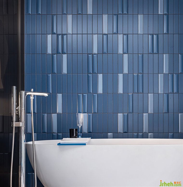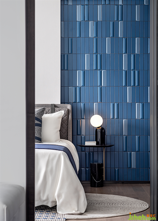 特别定制的蓝色系床头砖型背景材质延伸至浴室区,弥漫着主人无处安放的艺术的追求,独一无二却又不显突兀。