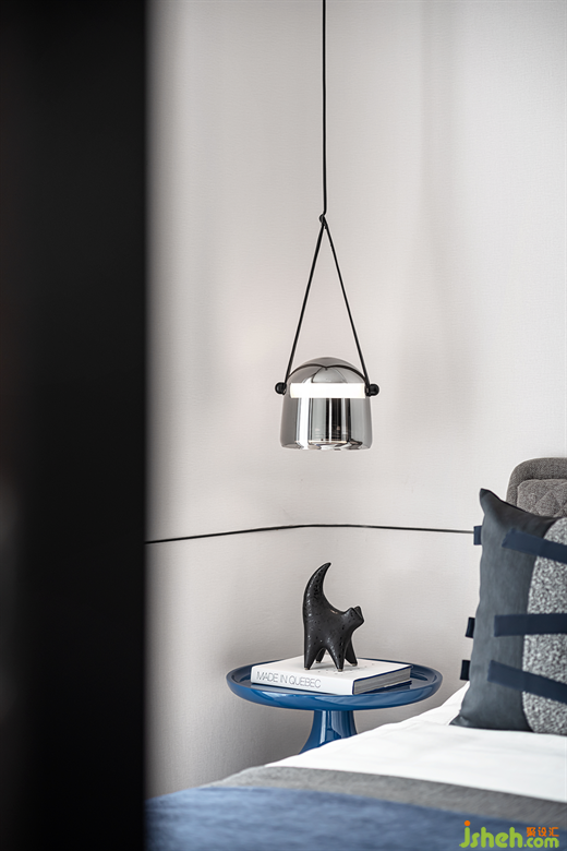 卧室延续了空间设计的整体性与一体化,比例和谐的蓝白搭配又一次被完美诠释。深圳样板房设计现代金属质感的精致吊灯,异形的黑色小雕塑,无一不展示着主人的极高的审美品味。