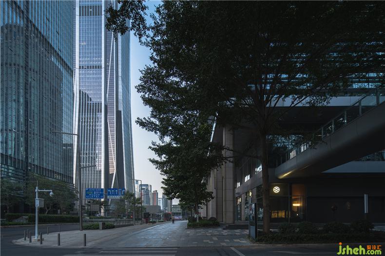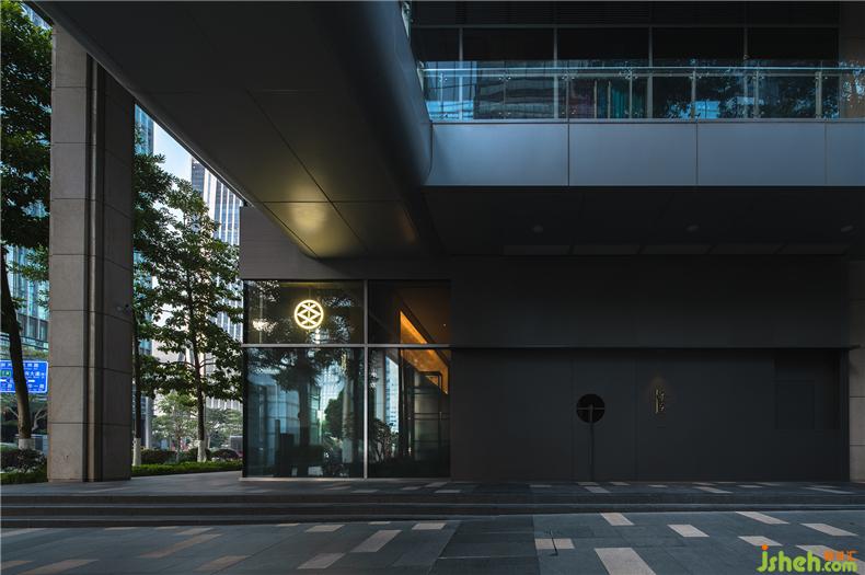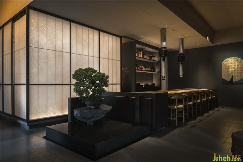 华灯初上,宛如日本家徽图案的“炎”字LOGO从门店临街的玻璃门上映射出光环,餐厅设计让路过的人得以辨析这并非是无人之境;与倒映之上郁郁葱葱的疏影层叠,又平添几分望不穿钢筋水泥与自然绿意交织的神秘未来感。