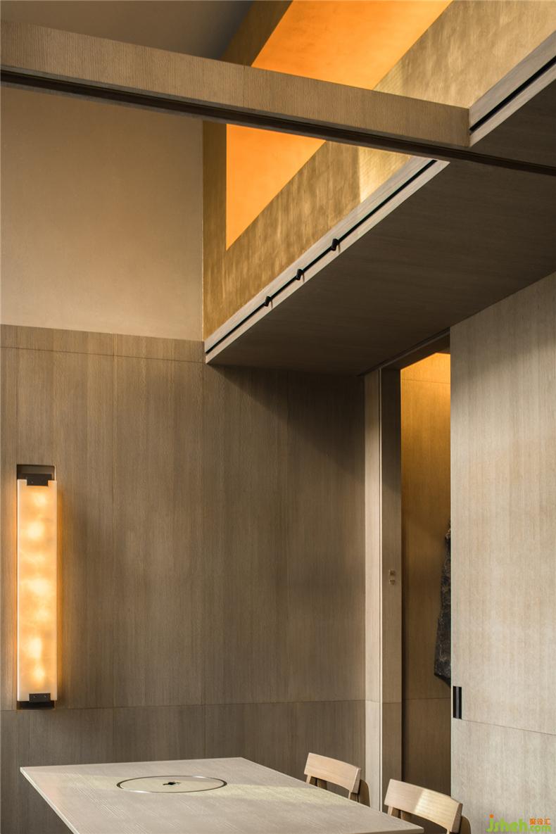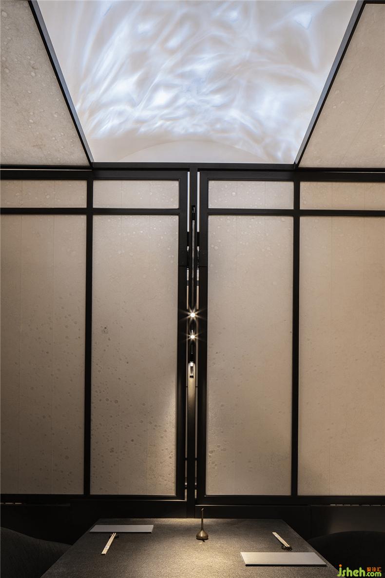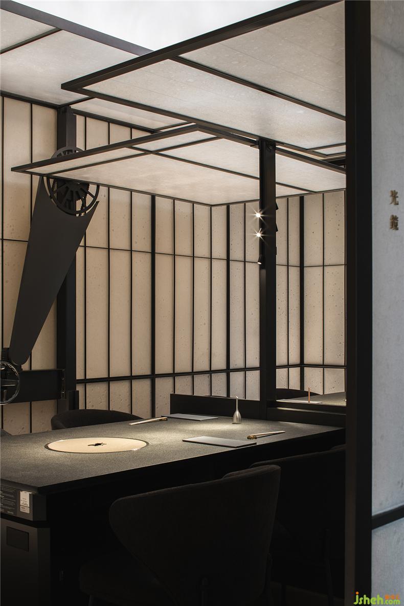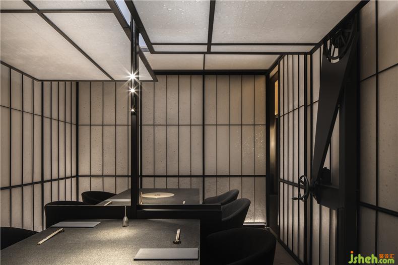 不同的空间以不同的材料进行装饰,金箔,金属烤漆,织物,木纹,餐厅设计营造出不同的氛围。包房开合自如,包房开合自由宛如京都的沿街小店,结合可升降的天花背景,模拟天空,引入自然元素,让空间有动态的美感。