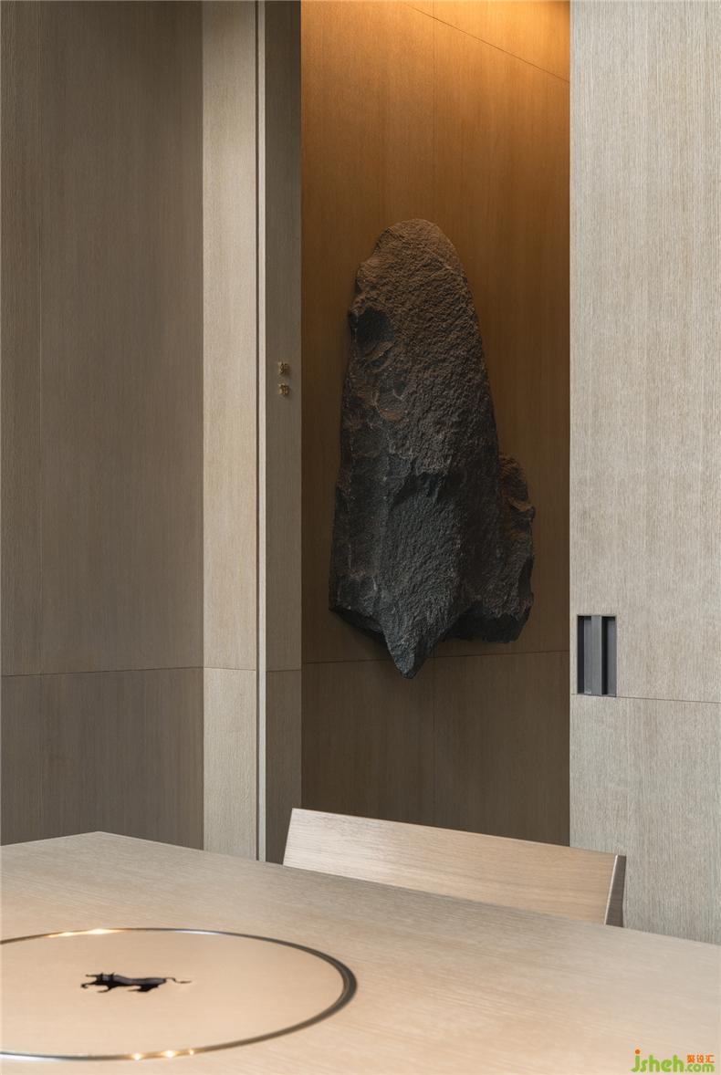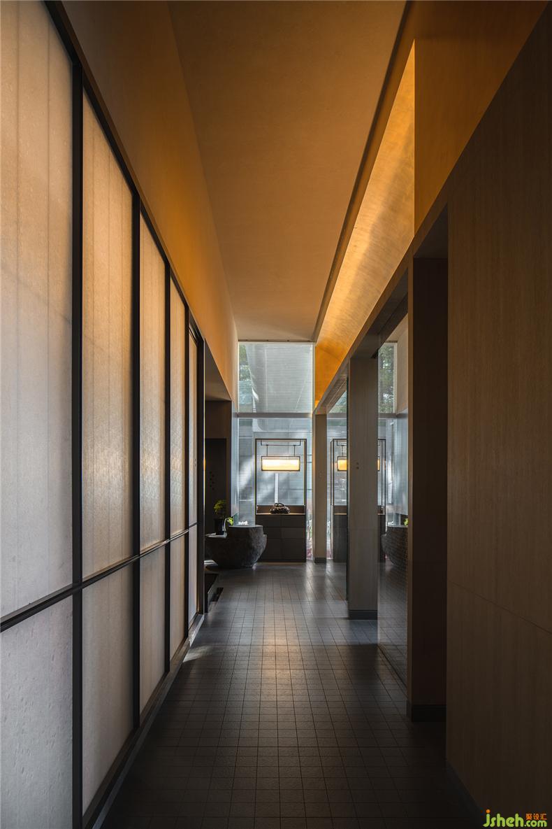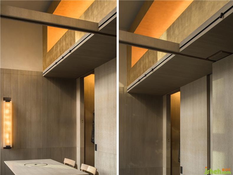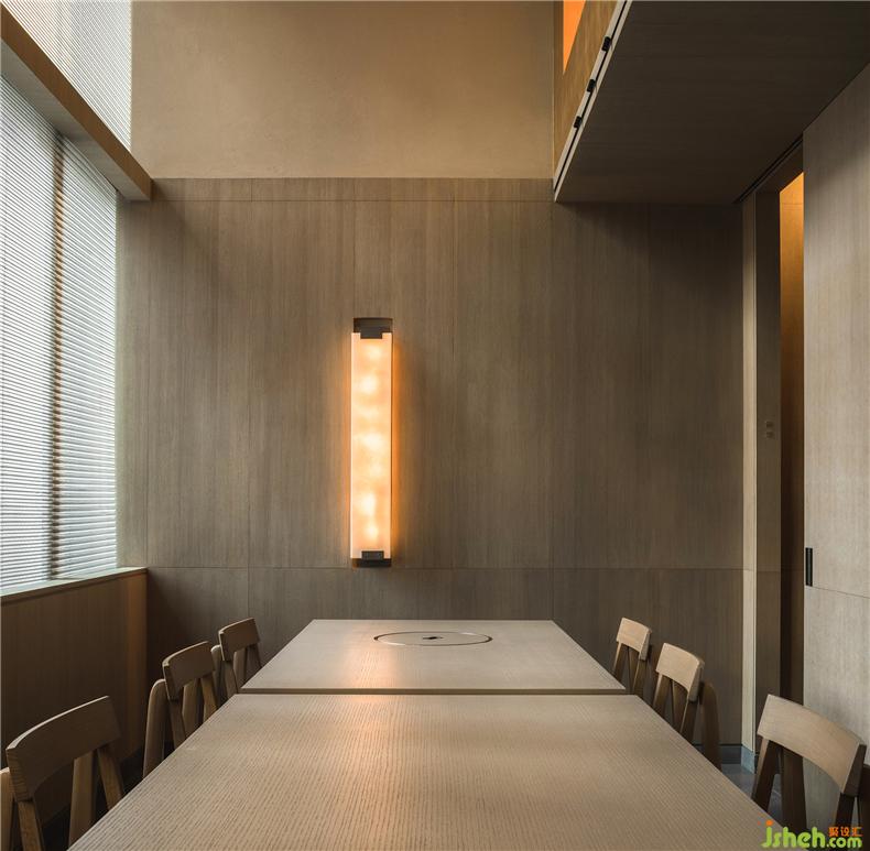 不同的空间以不同的材料进行装饰,金箔,金属烤漆,织物,木纹,餐厅设计营造出不同的氛围。包房开合自如,包房开合自由宛如京都的沿街小店,结合可升降的天花背景,模拟天空,引入自然元素,让空间有动态的美感。