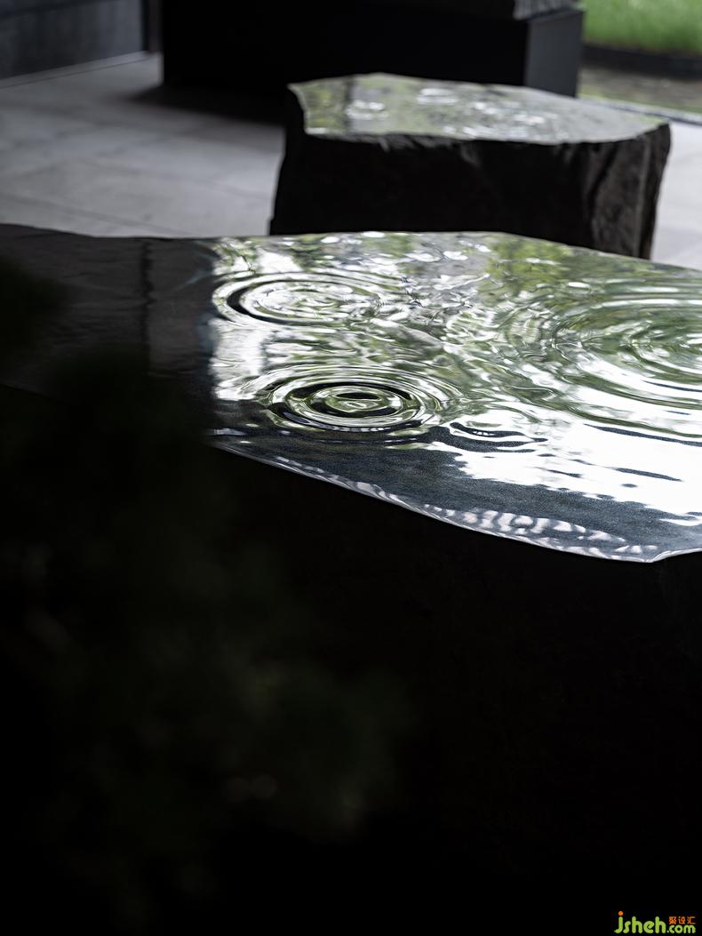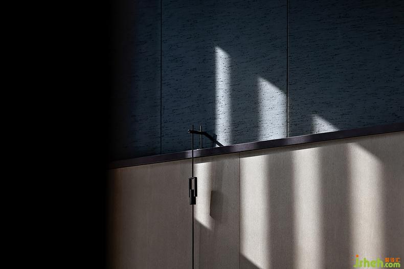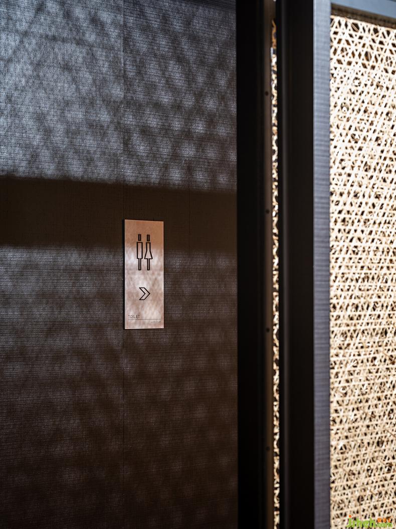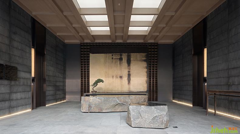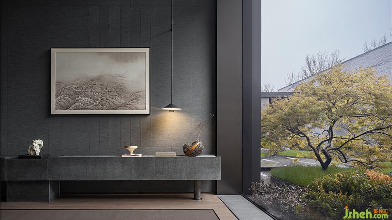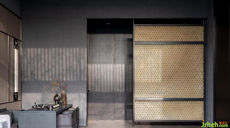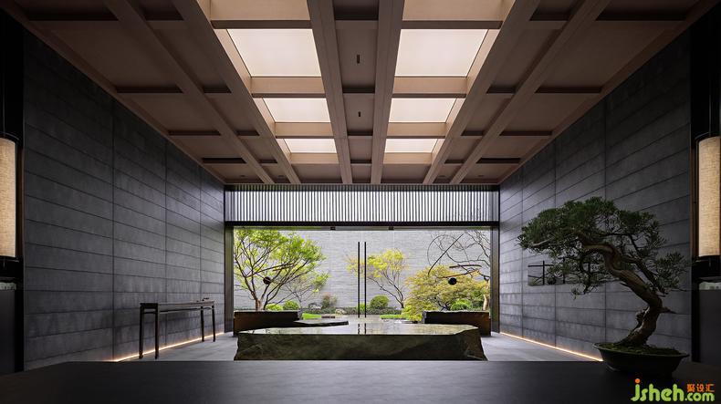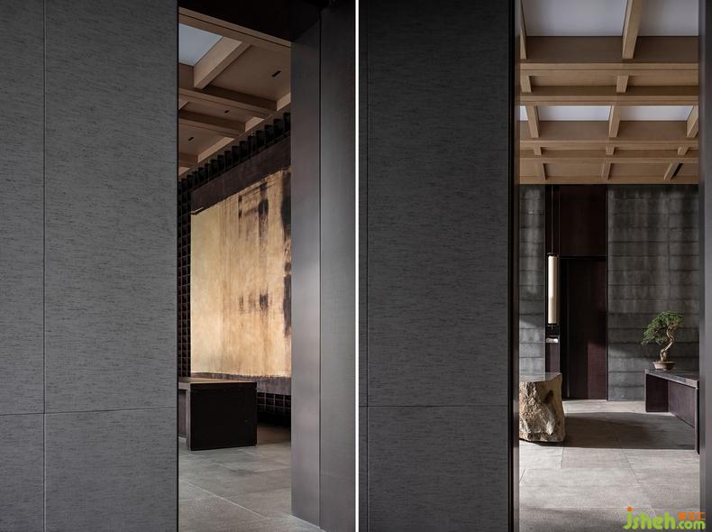 而静谧的深灰色统一了这个空间的基调,不论是深灰色石材的自然肌理,还是深灰色木质纹理的自然触感,再加上通过障子“过滤”的天顶光与经过格栅“镂雕”的庭院光的加持,整个空间呈现出一种明灭幽玄的妙境,仿佛一首关于时之光的诗歌,令人沉浸。但正面墙上的亚光砂金色墙面艺术装置则如一件巨幅的金箔书法作品,引人直视,简洁的画面在引发时空向往的同时,会所设计也带来不容忽视的精神力量。而前景处一棵造型窈袅的松树盆景则为这份当下的力量注入一缕高古的幽邃,配合着两尊自然随形的石台水景,有风过处涟漪跌荡,让人的心也随之涤清滤净。