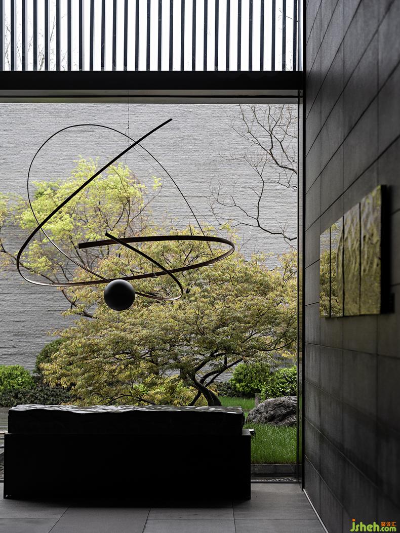 而整座美学馆空间的重点非艺术性莫属。特邀艺术家沈烈毅教授的艺术作品串联起每个空间的精神线索,也点亮了自然与诗韵主题。不论是在大理石上泛起涟漪的《雨》系列,还是如月光在湖面移行的《行月》,抑或是表现湖光山色、会所设计碧水连天的《跨虹》、《凭阑》与象征传统跟现代碰撞融合的《铁壳船》......每件作品都于艺术的巧思中可见大化自然的追求。同时,这些带着幽古之思的艺术作品还以深层的思考和简洁的表达连接起当代的审美省思。当石与水、月与风协奏共鸣,艺术品本身的坚实质感亦展现出动静皆宜的效果,令身在其中之人不知不觉就浸入了自然。