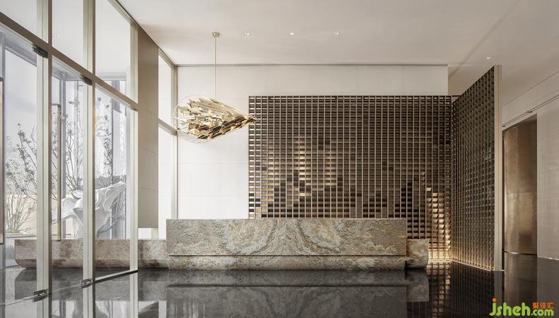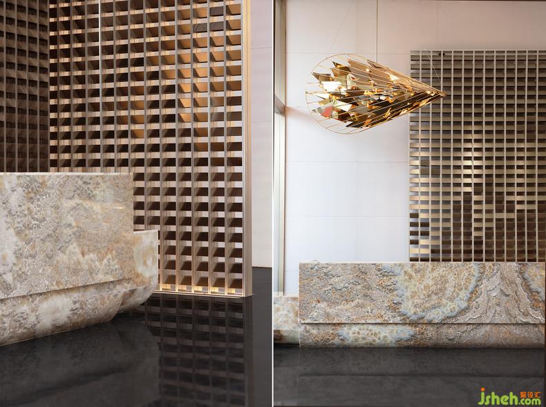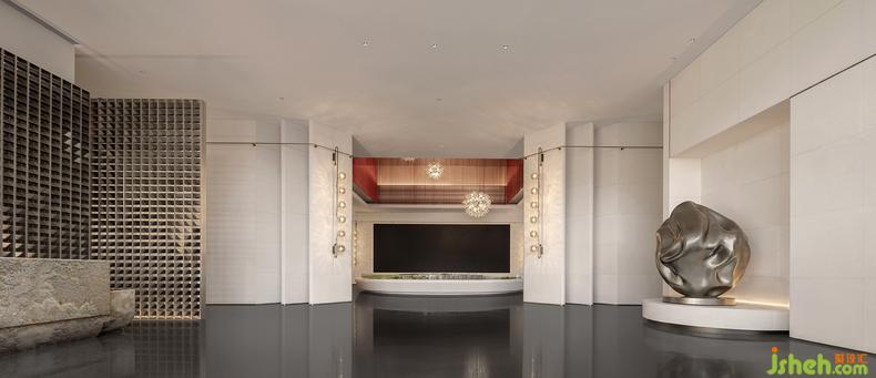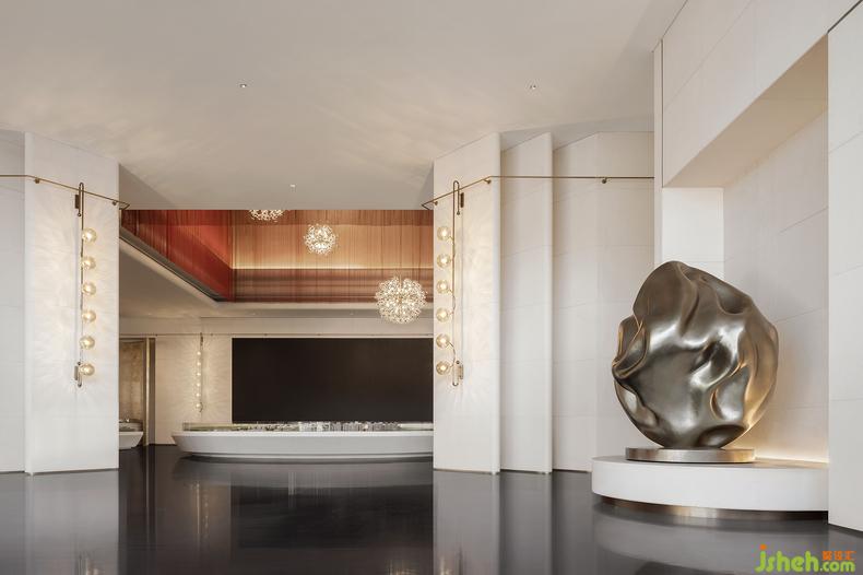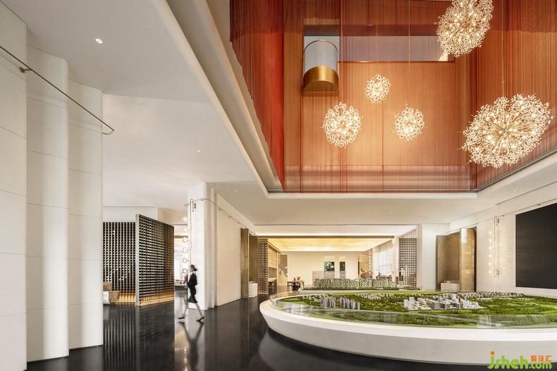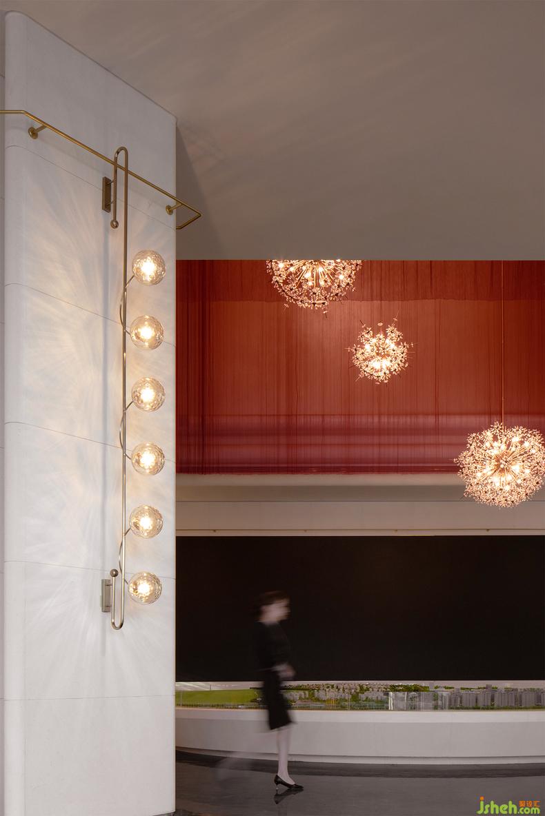 移步往前,由红色金属帘幕围坠起的沙盘区域恰似长河落日笼罩的幽谷,生活馆设计展示着专属这片土地的壮丽。金属帘幕从天花坠下,其材质透光特性带来的通透感让人在其中更感灵动,而红色主题又荡漾出一种少女舞姬那翩跹红裙与暧昧面纱的风情万种。帘幕中还间杂着几盏烟花般绽放的吊灯,让人如见落日、如遇星光,胸中更生无限瑰丽的遐想。