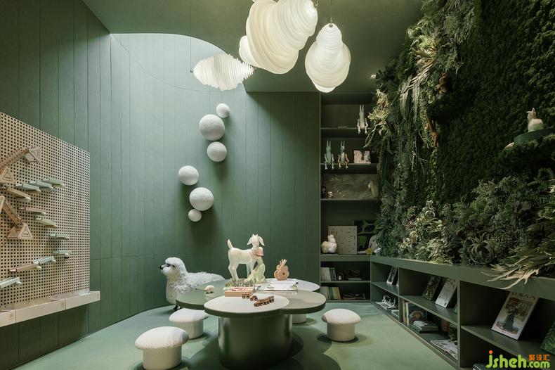 一层空间中另有一处特别的可爱“版图”,它便是专属于孩童的“奇旅之境”。生活馆设计绿色的基调如同新疆广阔的草场与原野,雪白的羊羔座椅与云朵吊灯则共同渲染出一派风吹草低见牛羊的和谐风光。