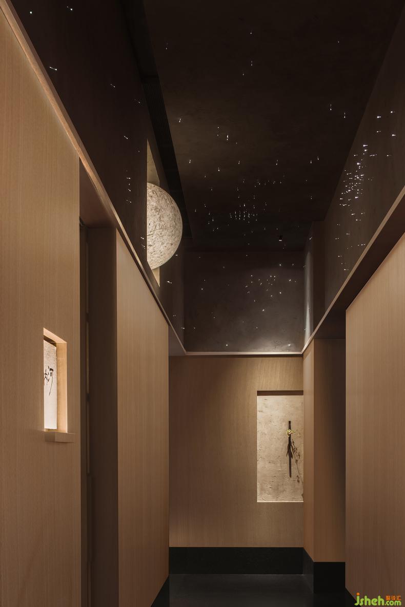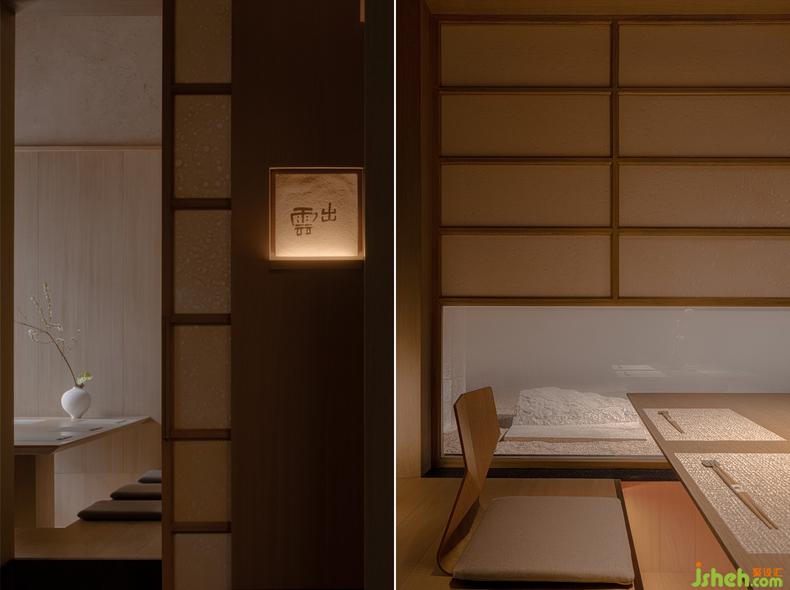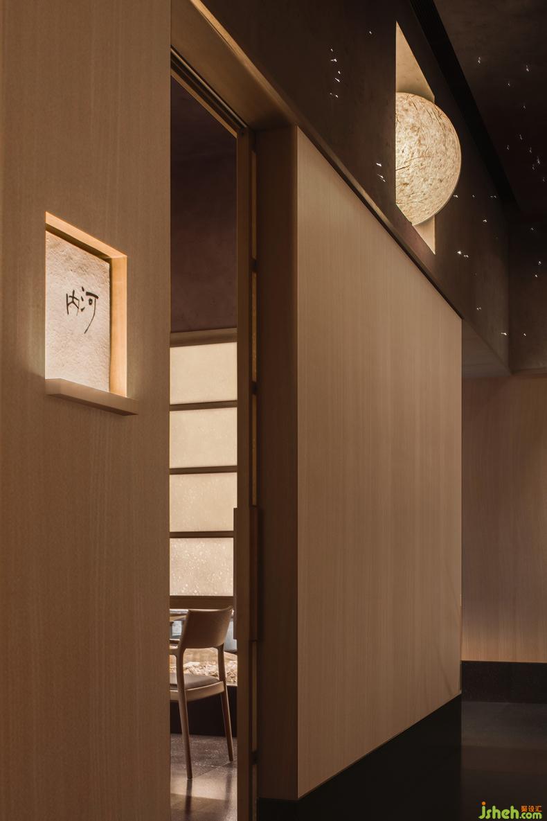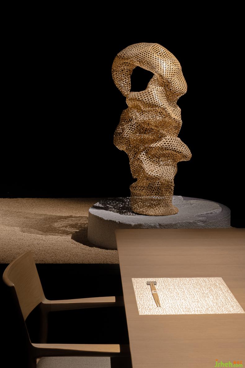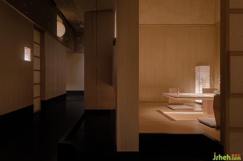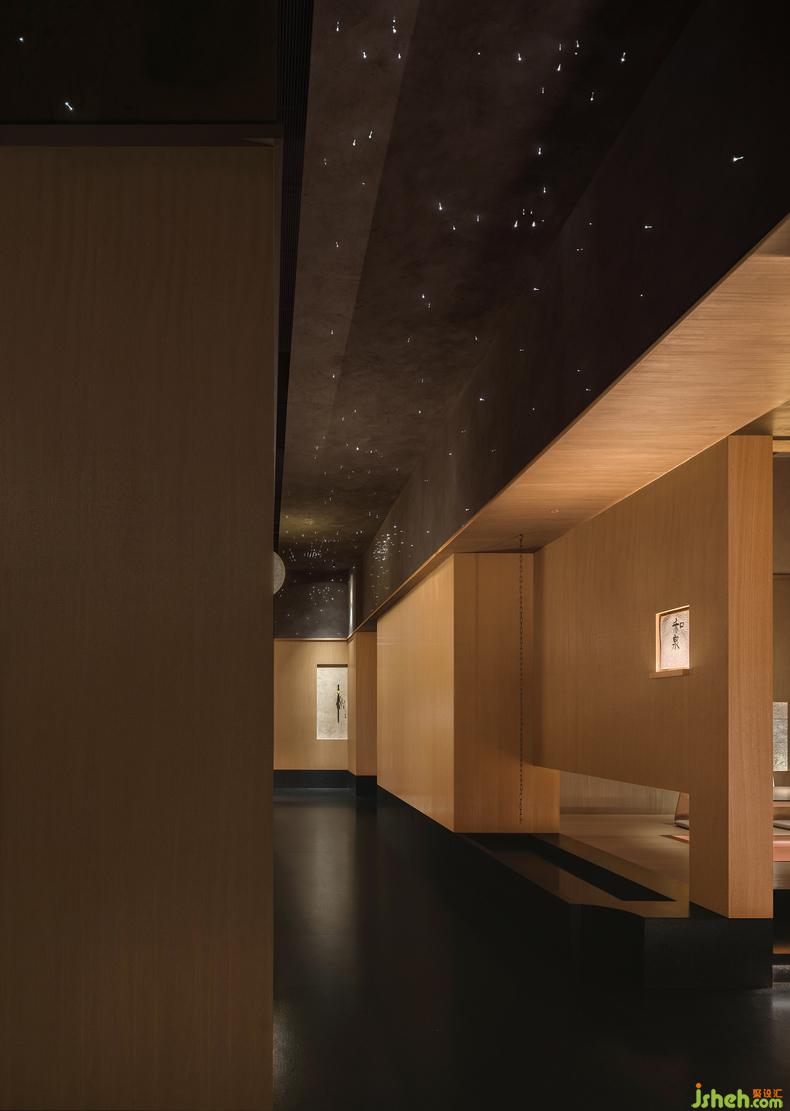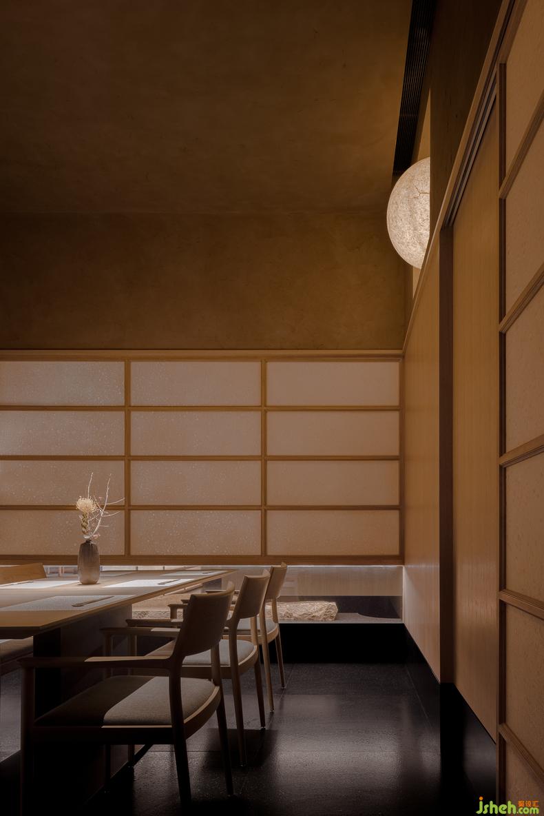 随机散布的流水、点石、植物、星空以及圆月,餐厅设计皆被隐忍的热情驱使,在有限的空间里氤氲出无限的四时风景。各个包间随动线错落分布,极具自然纹理感的障子纸构成半透明的隔离,创造了含蓄的感情分割,从无半分勉强与刻意营造。穿过隐约可见的屏障,能瞬间感受人影绰约与万物的精彩相遇,从低垂的泉水链,到手工竹编的艺术,种种图案及动态,一齐构成对自然万物的无限想象。
