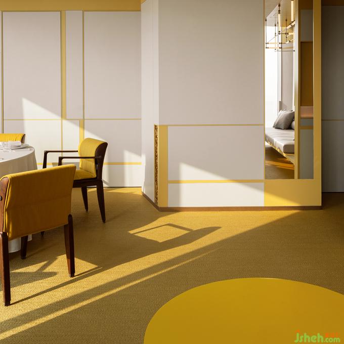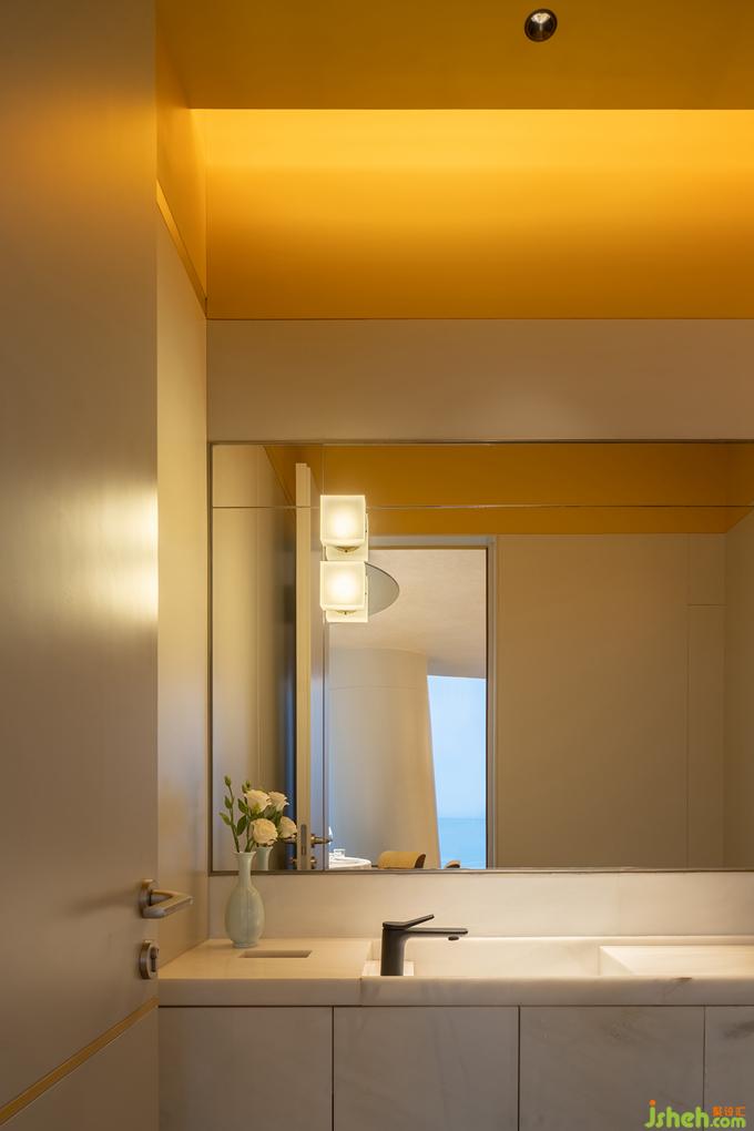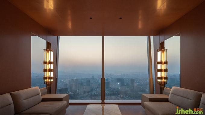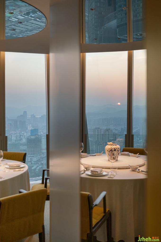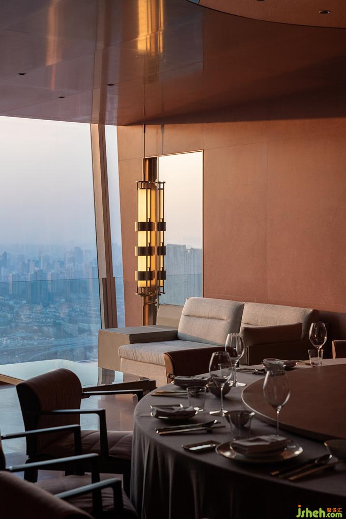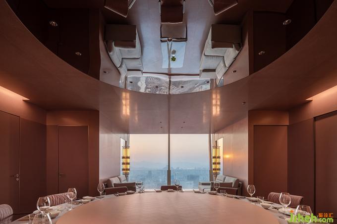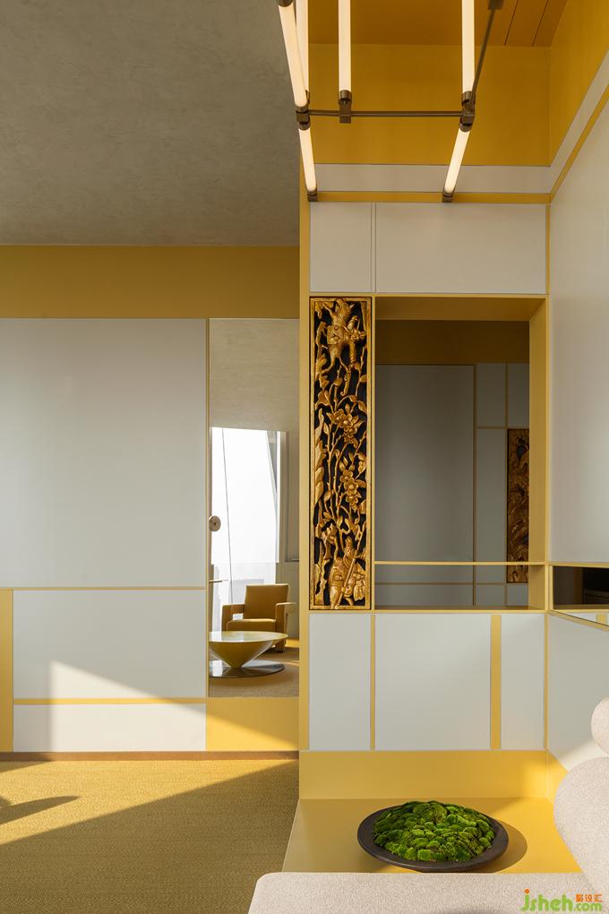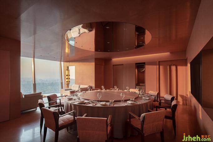 延续赤中带黄的西窗余晖意象,与“黄”相邻的空间提取茶汤的色泽并调和为低饱和的粉系,融会在介于真实呈现与诗意渲染之间的折中主义环境中,最大限度兼纳多元化的客群偏好。餐厅设计招式简净的界面体块穿插错位剪裁的嵌入式背景墙,在纵深层次的结构中塑造无限度的沉潜空间。而以色彩为线索并置串联的包间体系,皆纳入景观与天光作为空间参照,以一种相互包容渗透的关联组合回应这座城市开放复合的性格