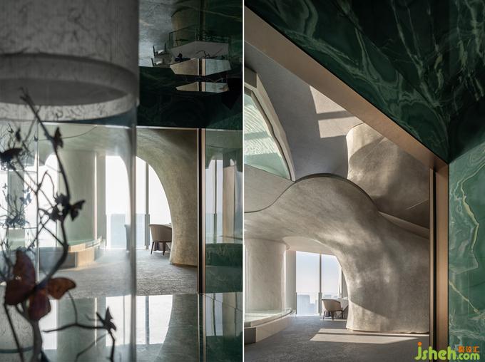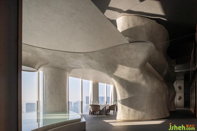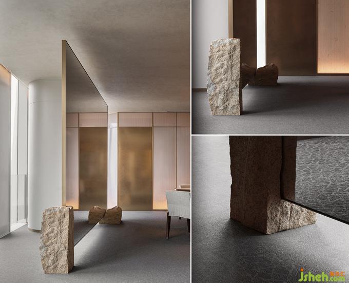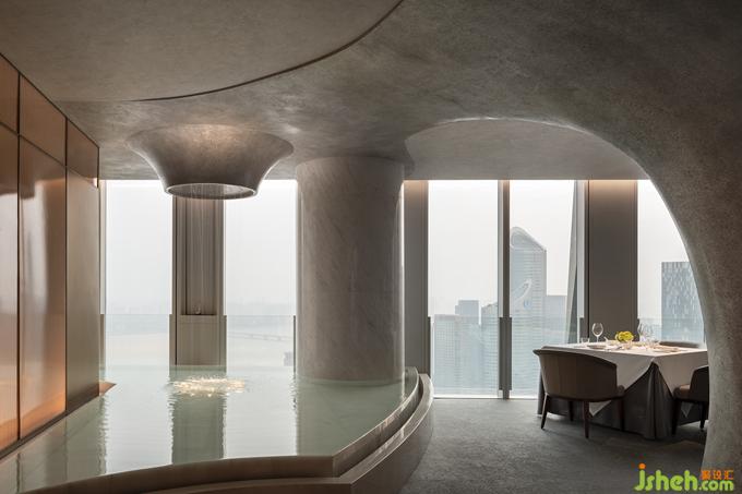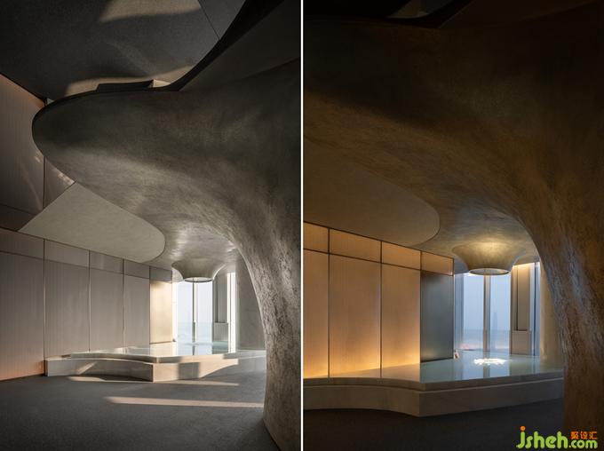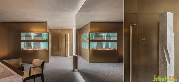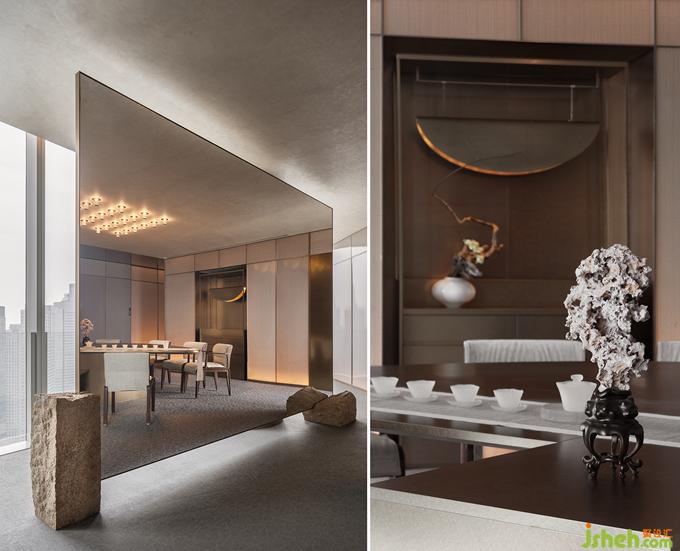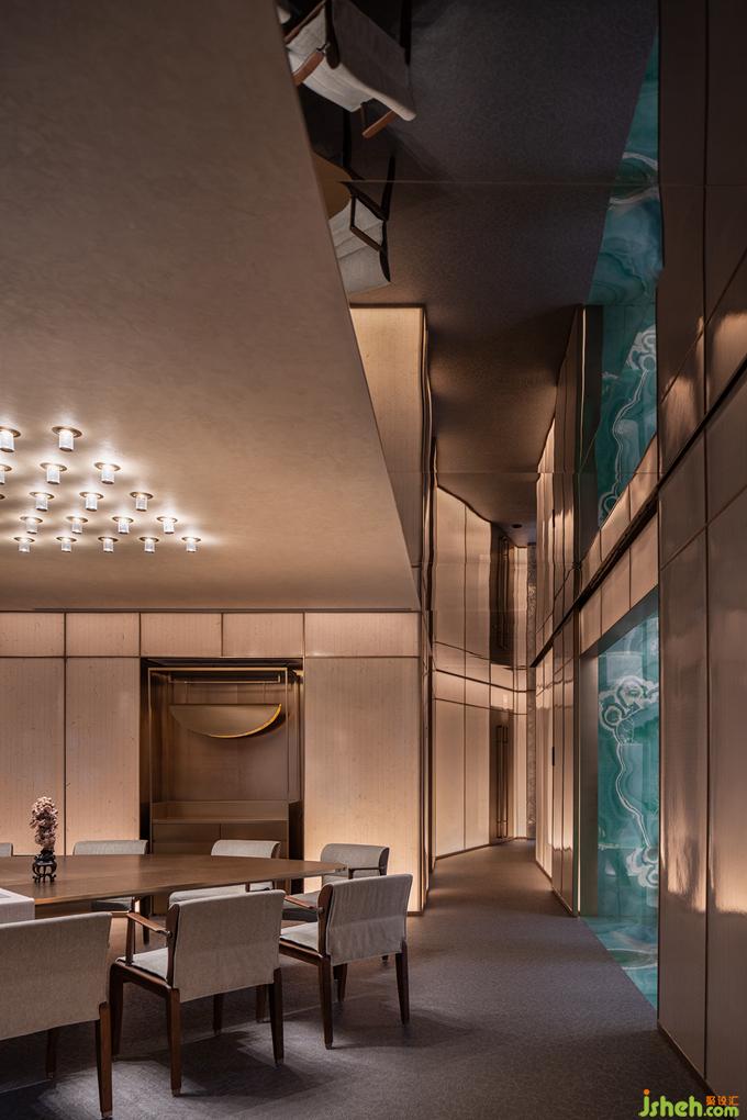 茶,作为潮汕与江南文化的连接点,浓淡之间浸润关联着生活习性乃至精神情感。水,更是岭东门户与鱼米之乡共通的根脉。电梯通道的一端为品茗区,粗粝的原石落点于直线切割的简劲空间形制,雅朴的山石肌理与远眺的山景静默对话。另一端为正厅散座区,有机起伏的异形银箔墙体回应钱塘江涨潮时的奔涌之势,端头的水景观与江景内外交融,再以水瀑声制造视与听的最大张力。