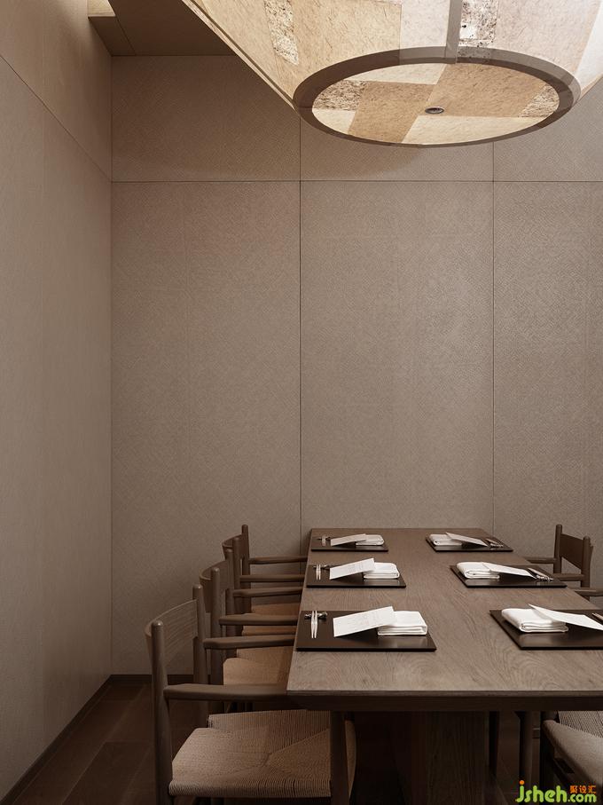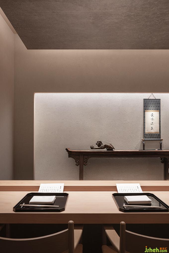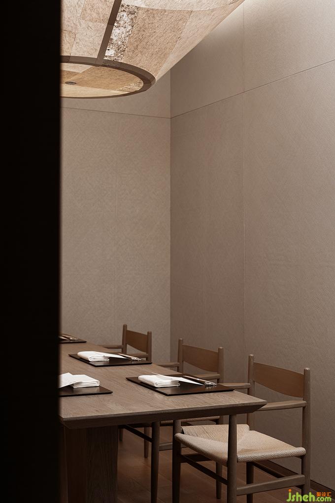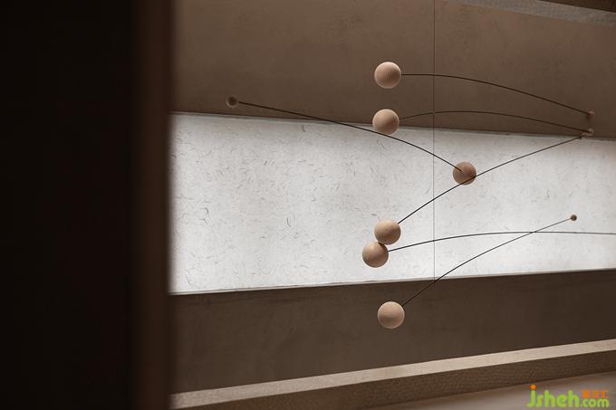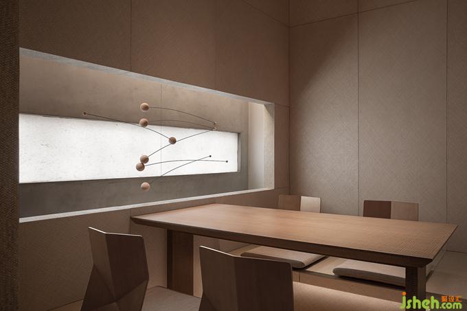 榻榻米包间藤席包裹起来的紧凑空间里没有多余的装饰,只开了一长条的窗洞,内外框景里是东方的哲思,漂浮着的装置因为不可触碰更像是茶道空间里的奥,在留白和丰盈的取舍里,见天地的广袤,见个体的渺小。