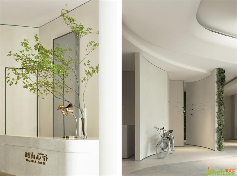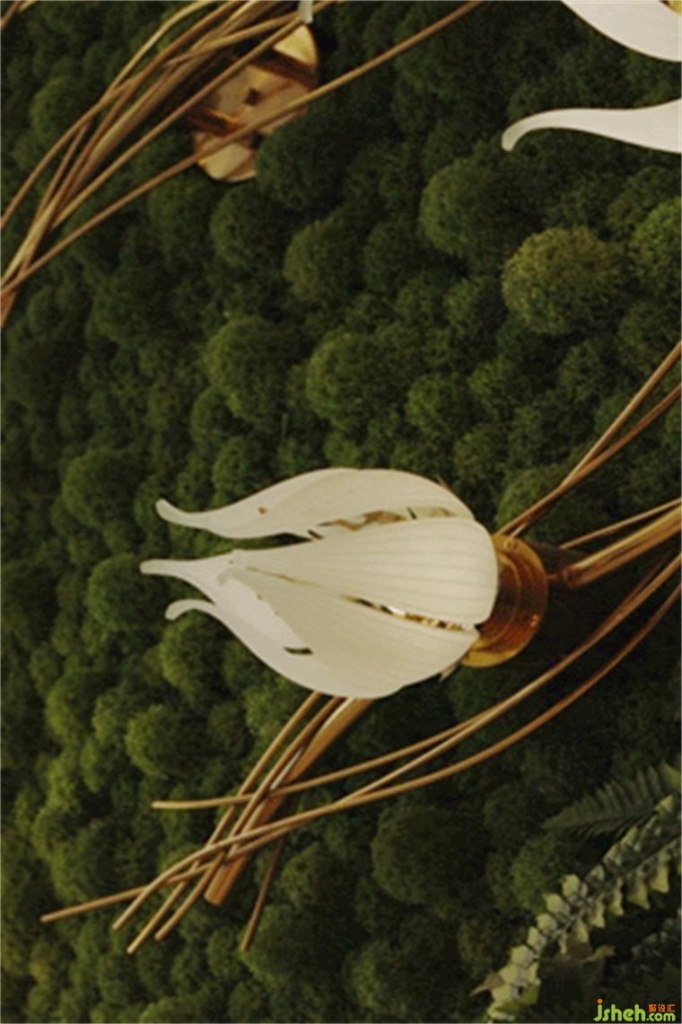 两面花艺肌理的绿植墙,语调清新,青苔、花朵、室内设计师和林间散步的小鹿,皆以艺术化的表现形式成为空间的一部分,呼应了所处的自然溪谷绝妙的自然氛围,成为了空间的主导。