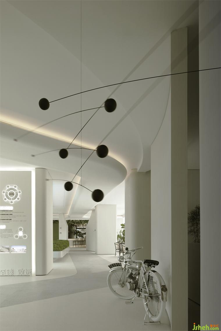 沙盘区与洽谈区规划为一处,室内设计师两面对外的落地窗将室外盎然的山水风景收进视野,曲线优雅的编织藤椅略带浪漫属性,为舒适的谈话、休憩提供了全然放松的环境氛围。