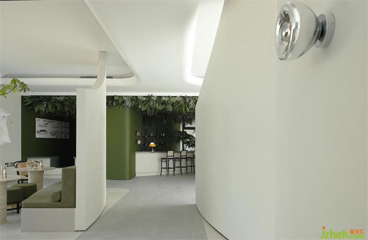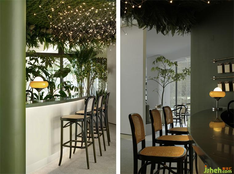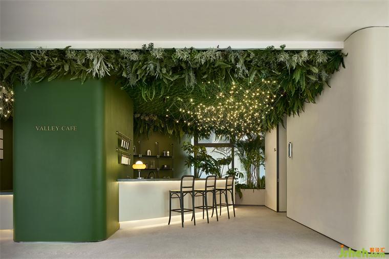 一层的餐厅以“花屿”为主题, 室内设计师整面数字花园的智能装置,为原本安静、平缓的空间,注入了流动感。暗黑背景的电子屏幕上,花开花谢变得转瞬即逝,映生一种独特的“室内景观”。