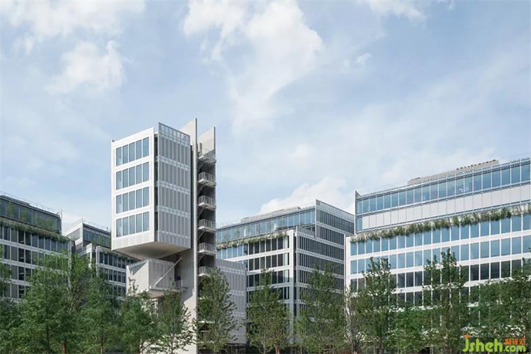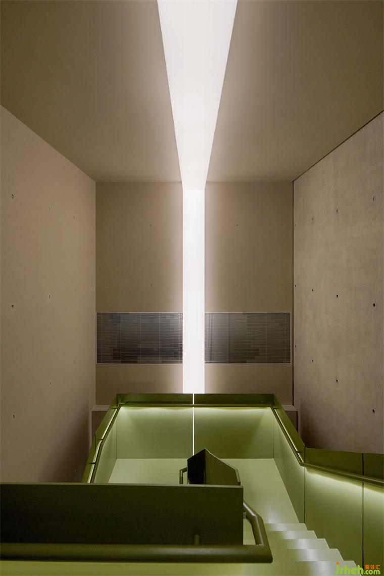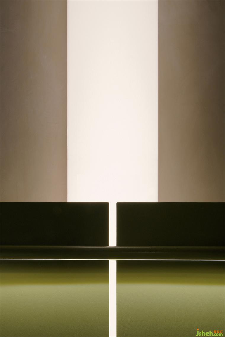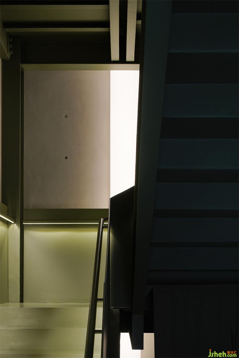 经过十号楼东侧餐车外摆区,在灯箱标识的指引下便抵达餐厅的入口。沿着绿色钢结构楼梯拾级而上,在身体移位的过程中,正对面附墙而上如生命体般的白色发光箱体在楼梯形体的裁切下,以动态片段式局部显露。