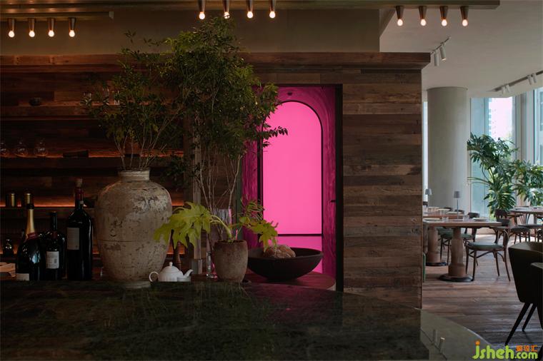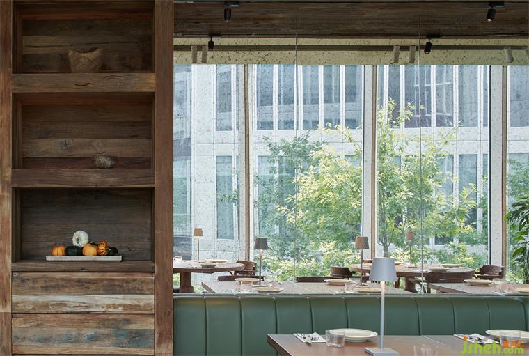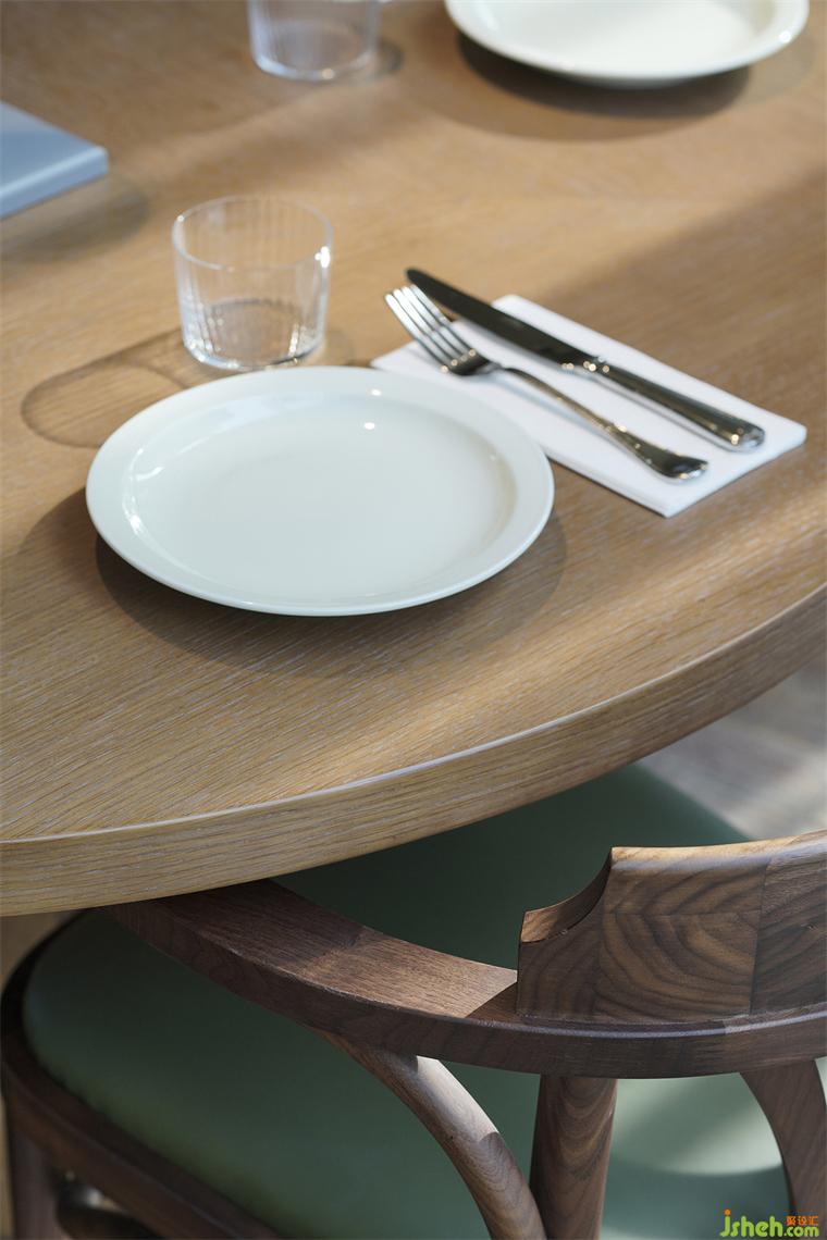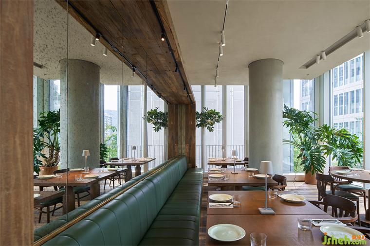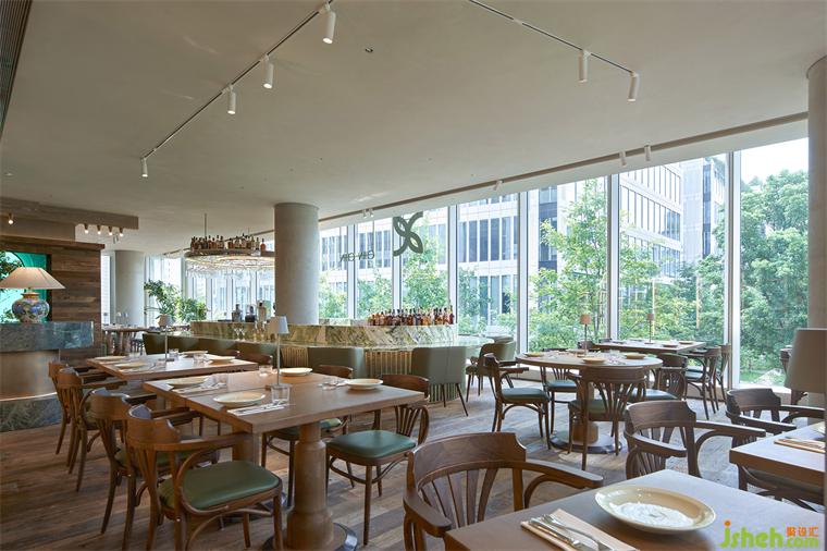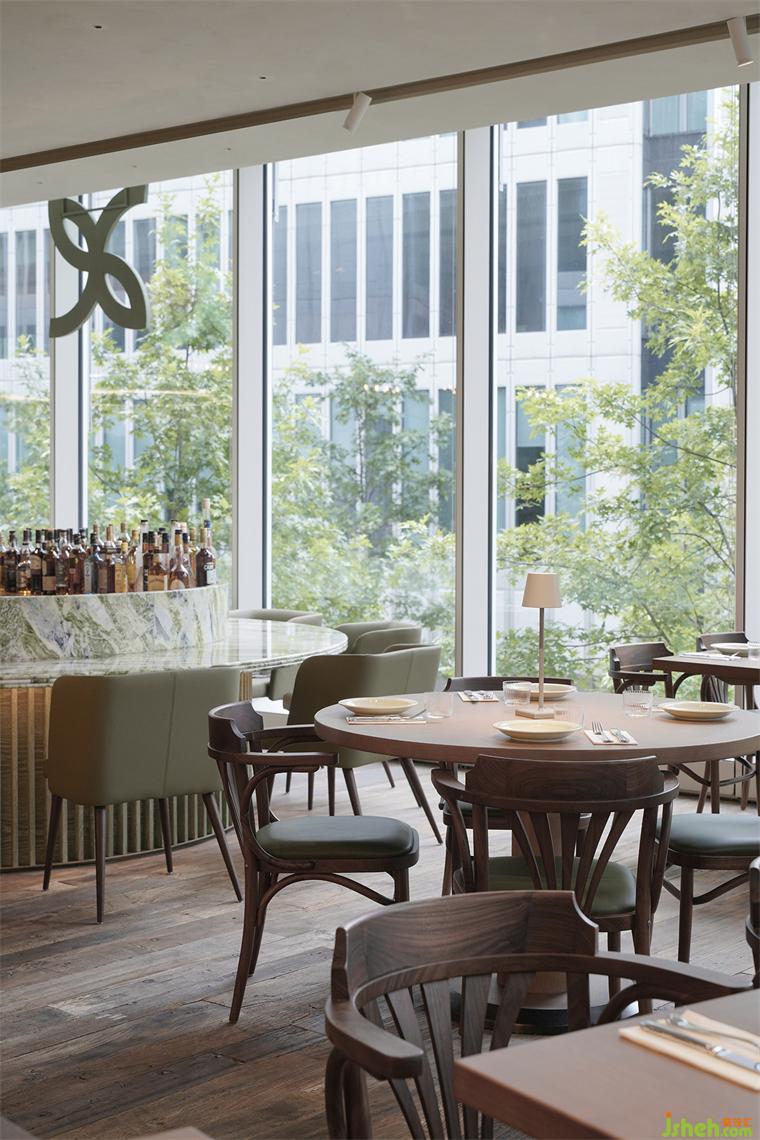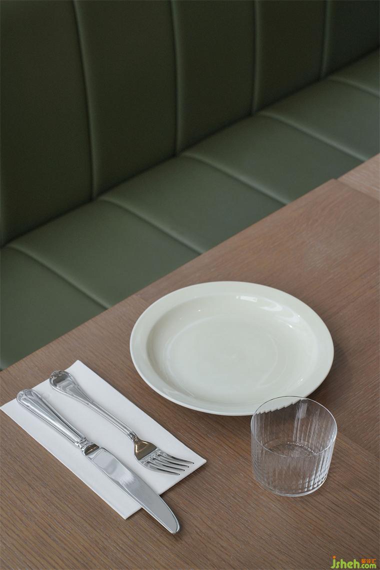 翡翠绿大理石纹理如甜点般质感,搭配以绿色橡木纹理材质,餐厅设计整体以一种优雅的姿态,在餐厅入口的不远处,静候客人的到来。