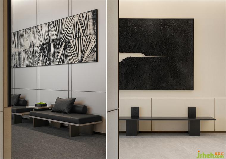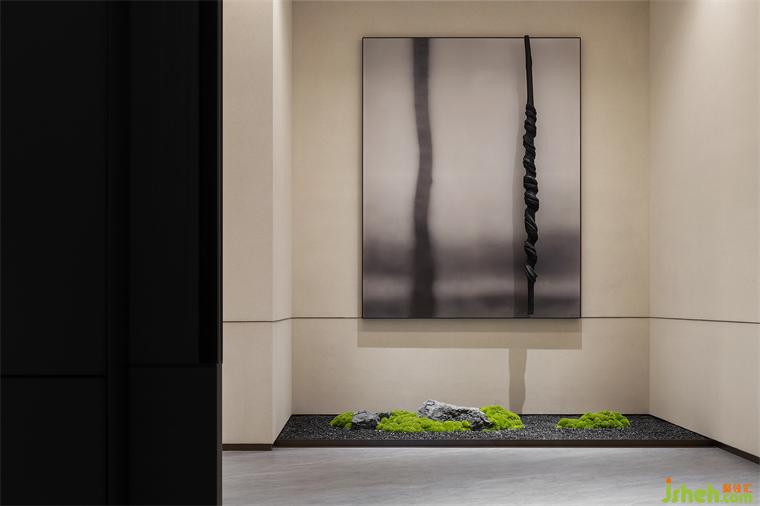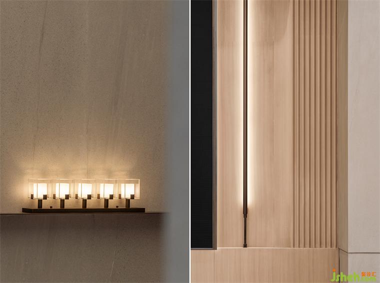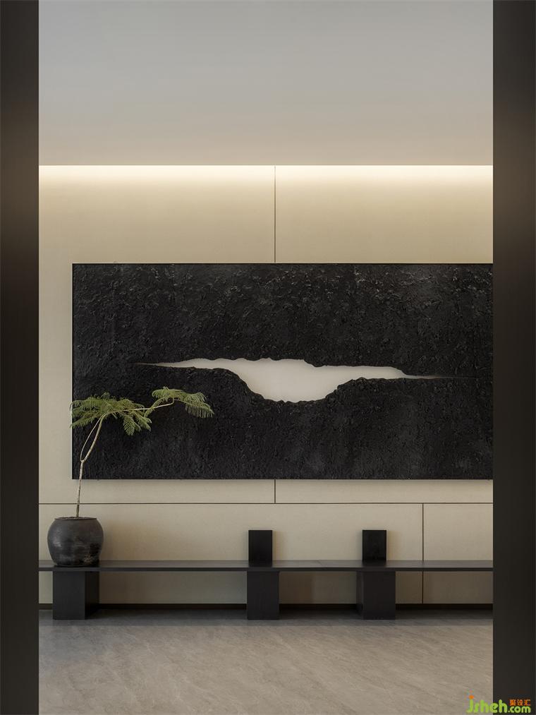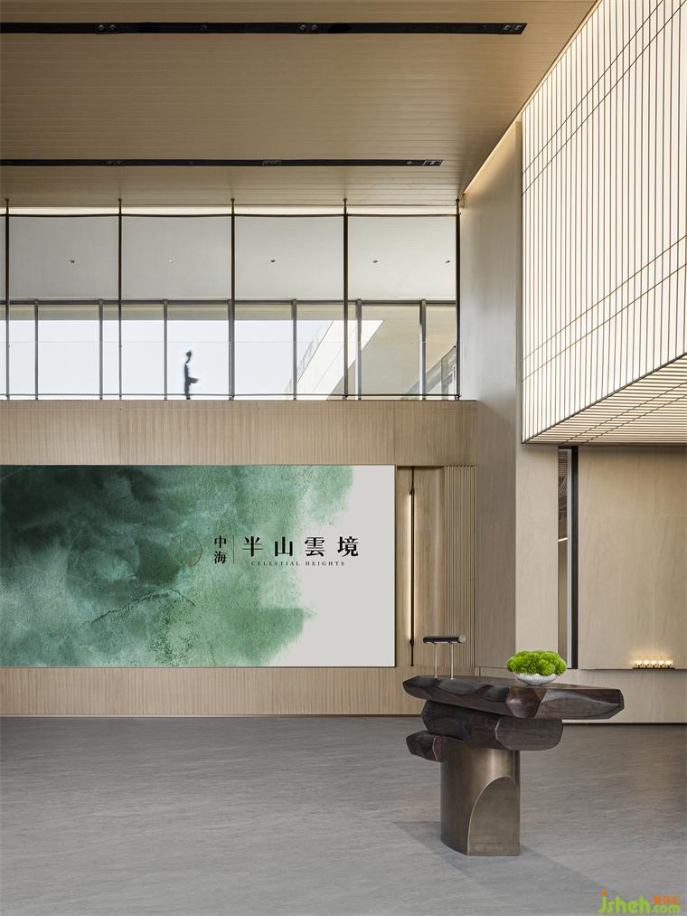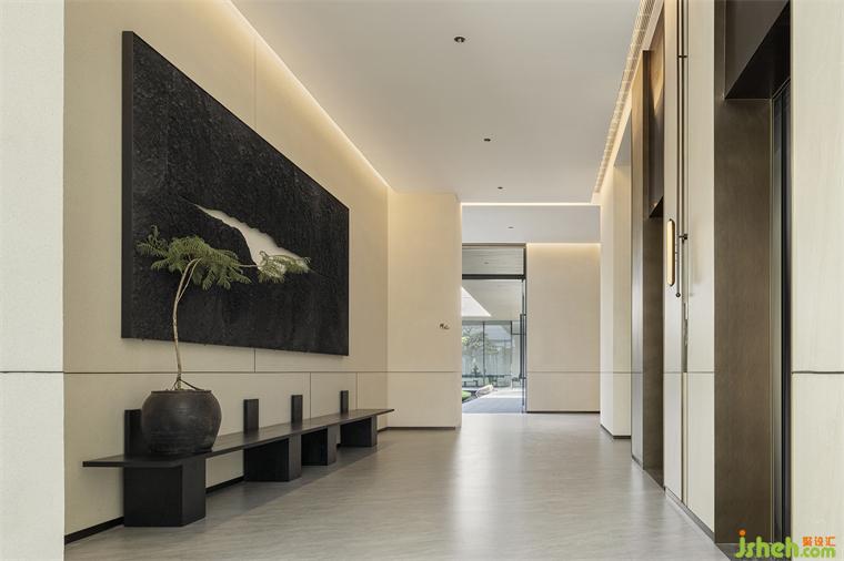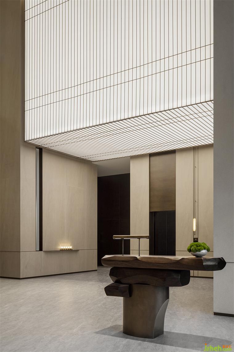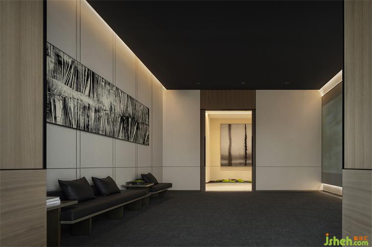 青松引路,从宾至如归的酒店式入口开始,这场诗意洄游就拉开了它的序幕。沉稳的硬木饰面与苍郁的黛石块面衬托出“山”的硬朗大气,令高阔的接待大厅空间尽显中正之气。艺术化的木质接待台仿若案头雅物,装修设计值得玩味;隐现其间的金属硬装则增添了现代的质感和调性,令偏居一侧的悬浮感“光盒子”呈现出艺术性与魔幻感兼具的魅力。