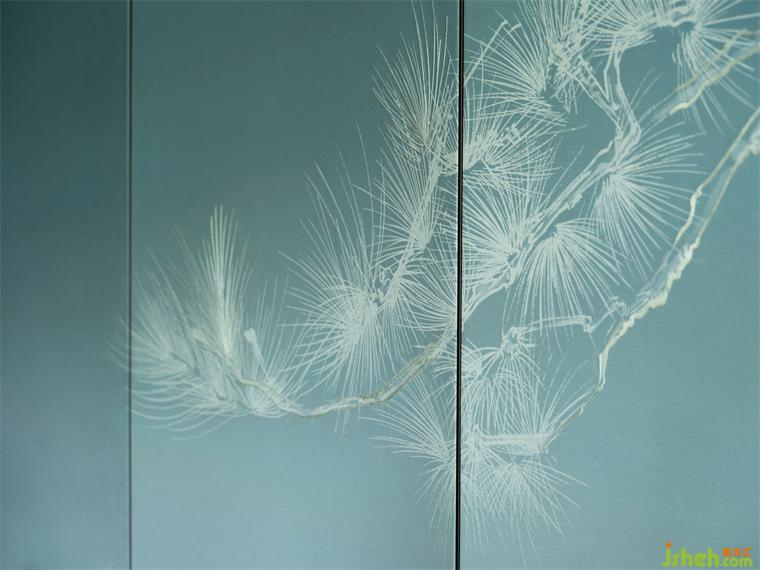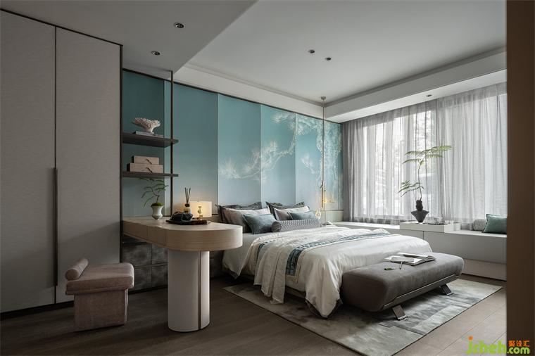 床头墙壁以宁静的蓝色风帆装饰,描以古松。