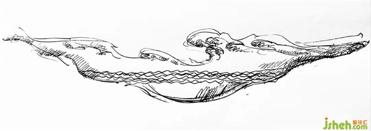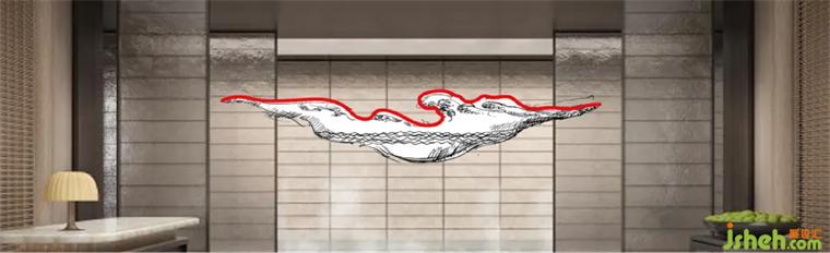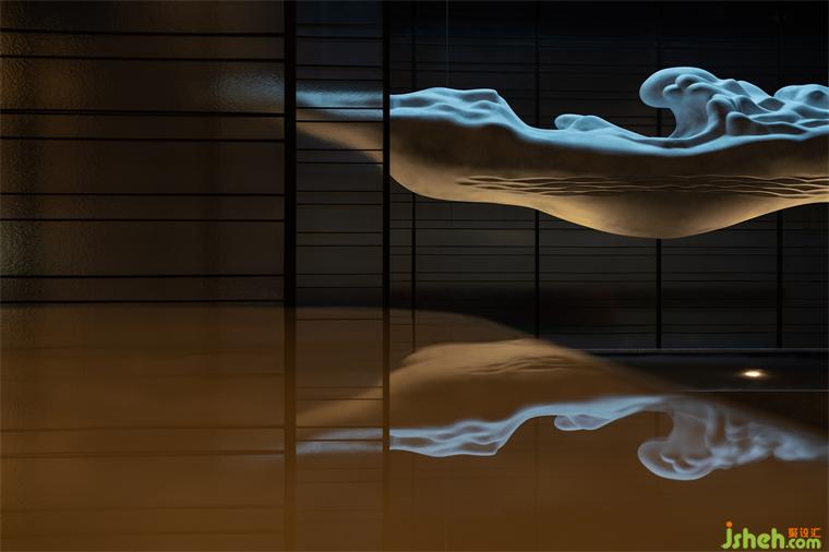 云与浪幻化为船只的形态,含蓄巧妙的对雕塑本体施以静谧的负形水纹,就像船只行驶在水面上,由水面的波光反射到船身处。以间接的表达来衬托船只在水面上前行,诗意而浪漫。装修设计负形手法的水纹,在阴阳的变幻之间更彰显着东方的文化韵味。