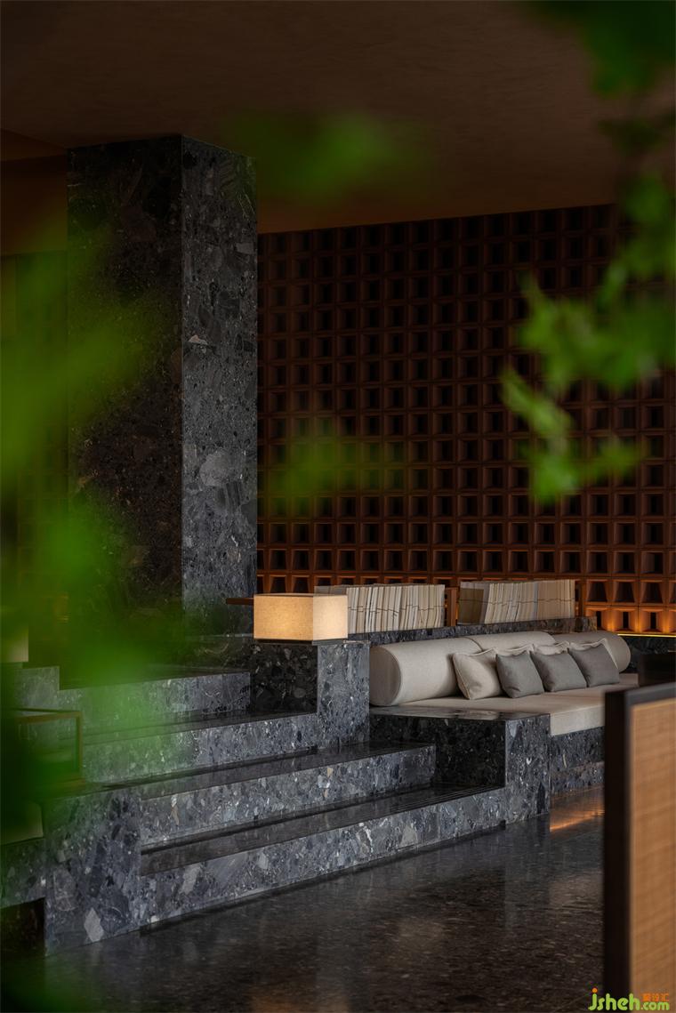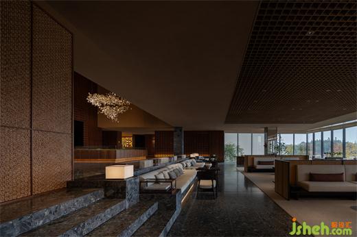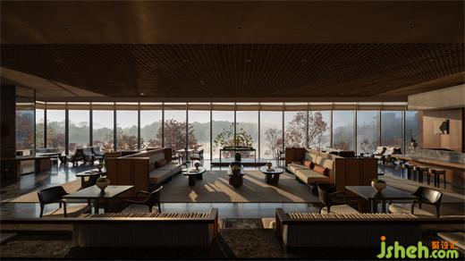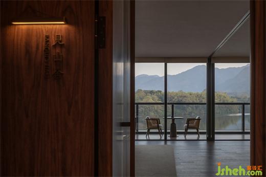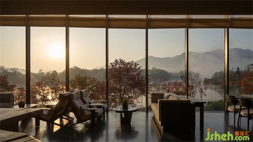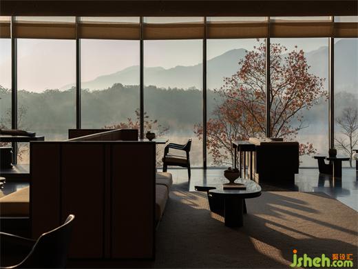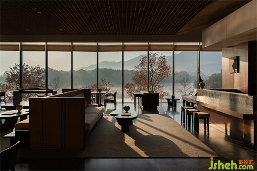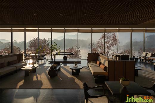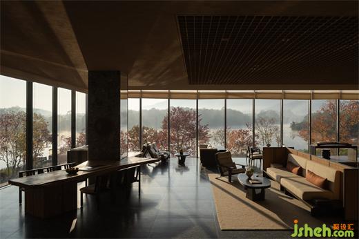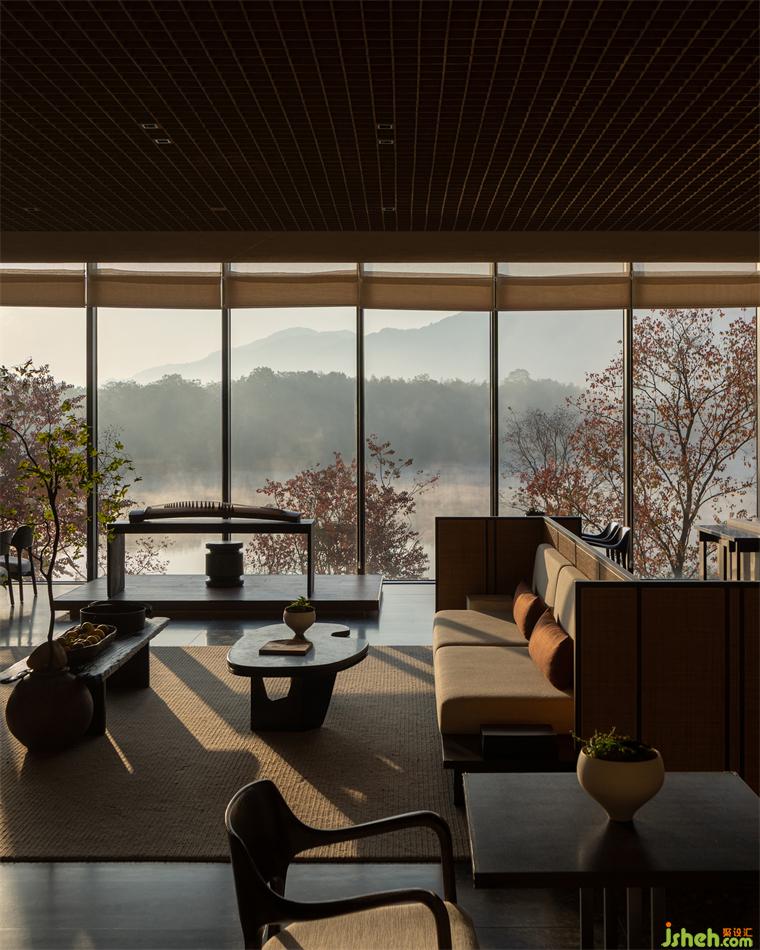 乡村的形成源于自然,追溯原乡生活的空间,也应学会去呼应原始肌理。艺术馆设计转入洽谈区,设计师充分利用山水之景,通过大面积的落地玻璃窗让建筑在自然对话中“隐退”,与山水树木发生联系。