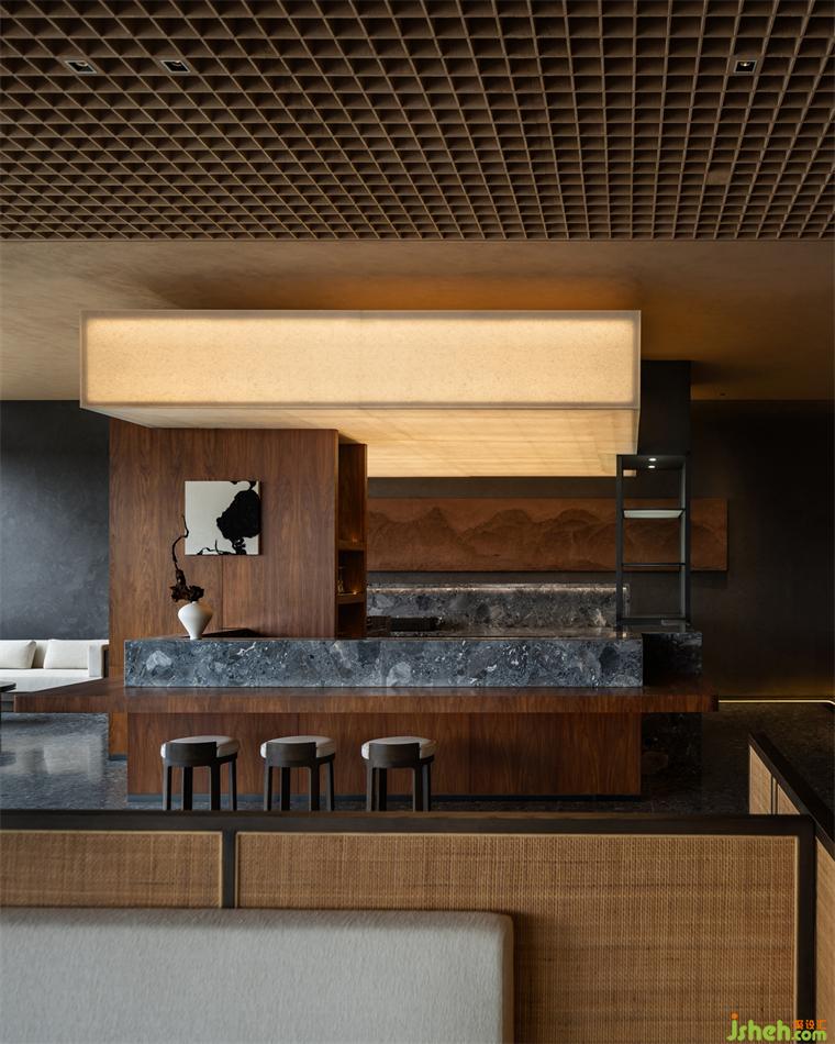 水吧区临窗而设,更在室内重塑山水自然景观。金华富含红壤资源,艺术馆设计背景墙巨型泥土艺术画以当地自然红色夯土绘制,呼应当地自然环境。大量木质与石材的运用,于内部空间塑造山水气质,与窗外风景共生、共舞。