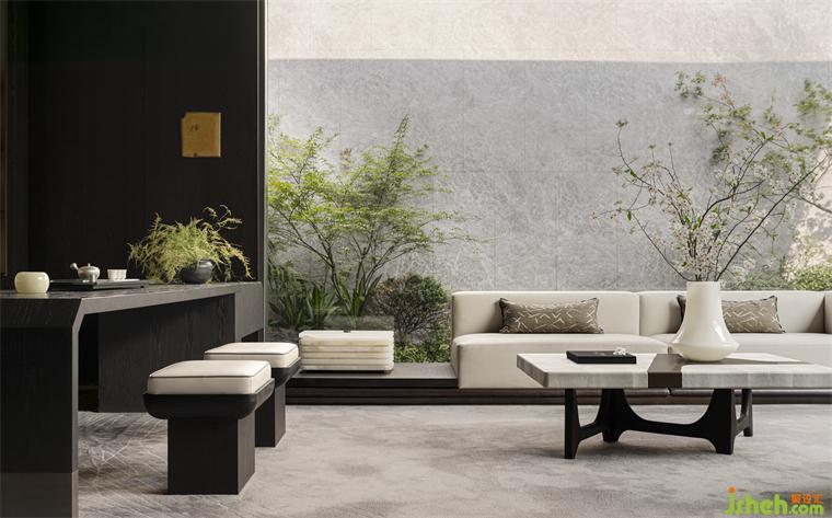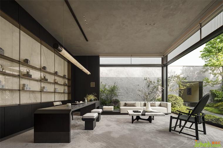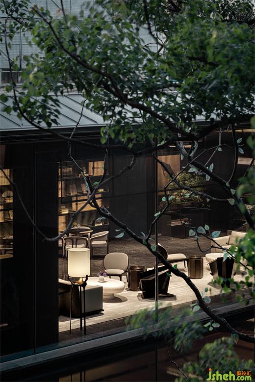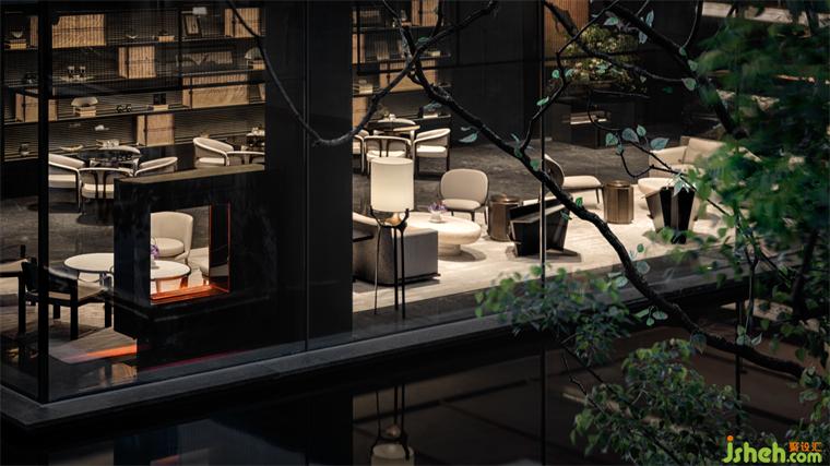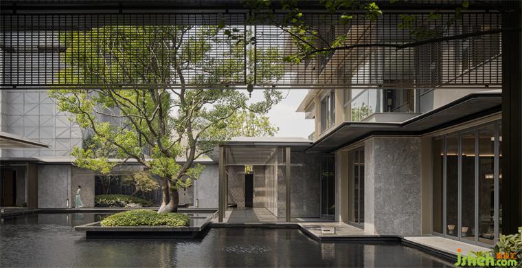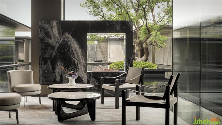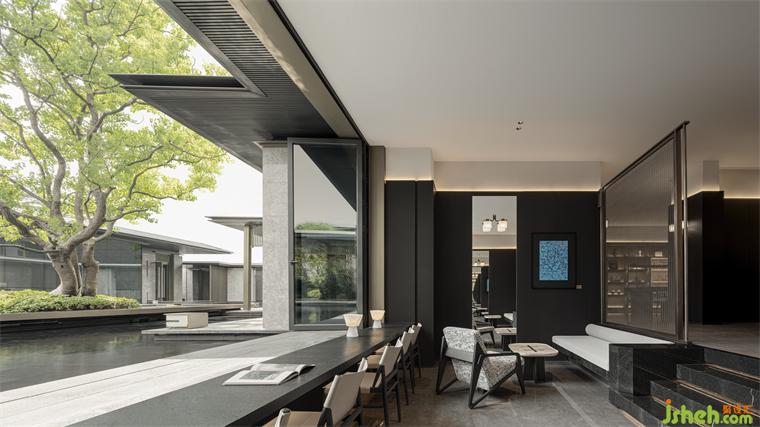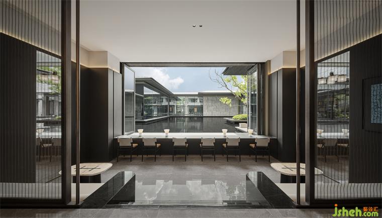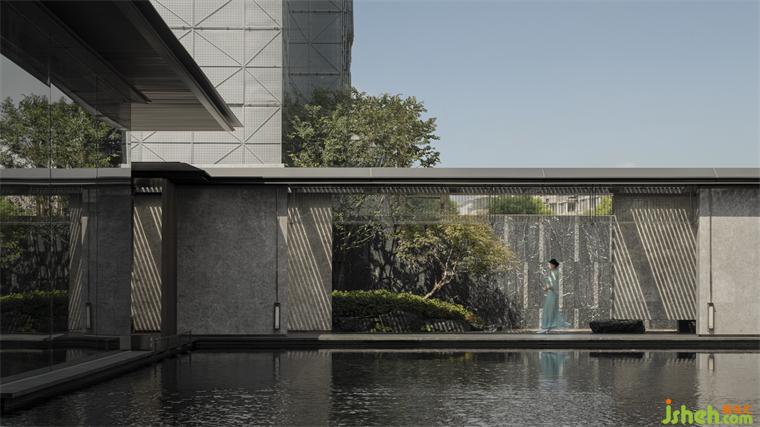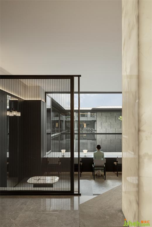 各空间与中央的景观水院通过长廊衔接,隐现区隔,阡陌通达,会所设计同享一片水院,又相互独立,享有截然不同的景致体验,游园氛围便这样慢慢涤荡开来。