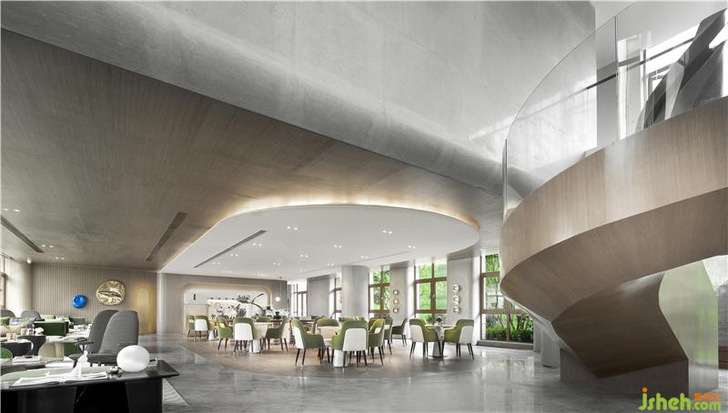 巨大的木质螺旋楼梯用流动的线条隐喻相对的热闹,与静谧的空间形成鲜明的对比。定格在空中的兔子雕塑恰有归家之意,形象地契合森林的主题。过渡空间独具匠心的描绘一幅盎然生动的画面,行至此,感生活乐趣。