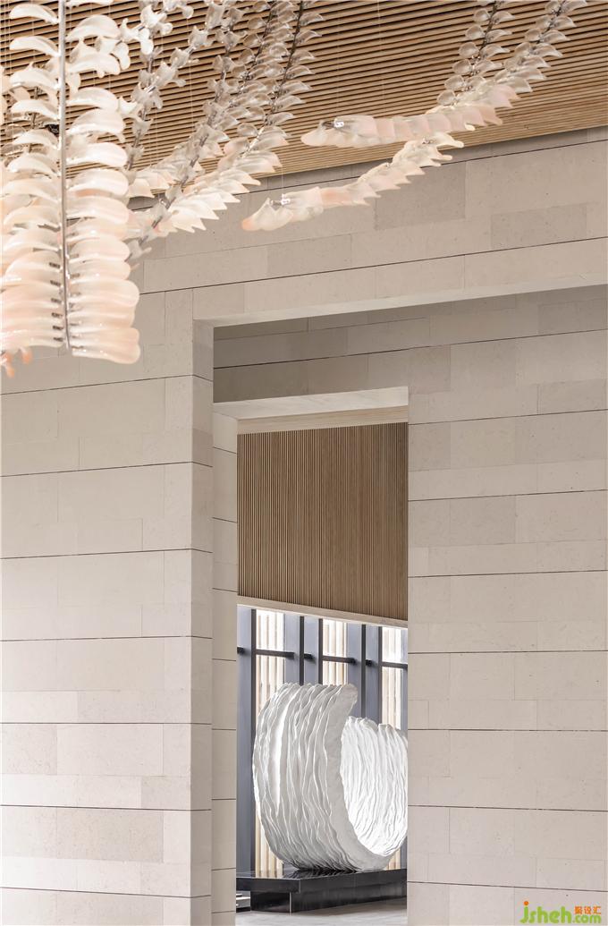 沙盘区的回字空间,大面落地玻璃,可以感受完整大面的舒适临光。阳光萦绕渗入屋顶空间上的片片莲花瓣中。艺术装置运用串起的花瓣,将光透过琉璃折射的静态转化为超凡脱俗,盈光婷婷的脉络。一个空间,有了信仰的审美,便开始领悟在时间中的修行。