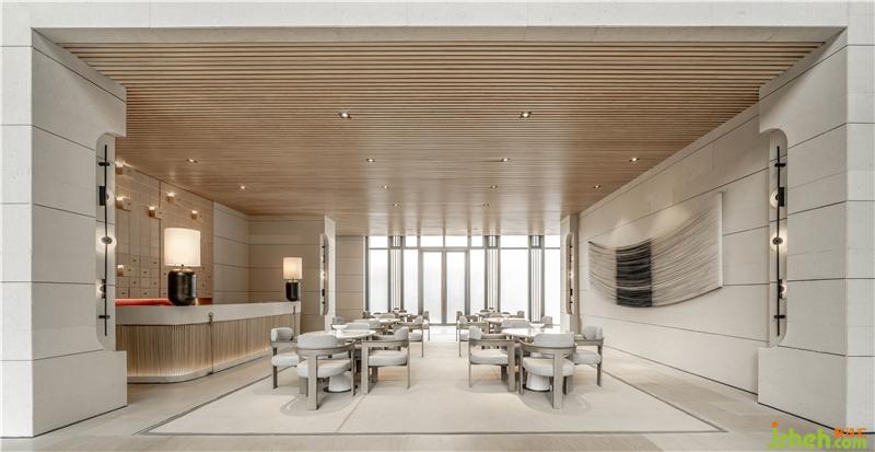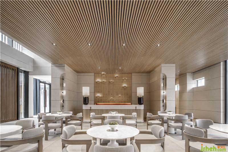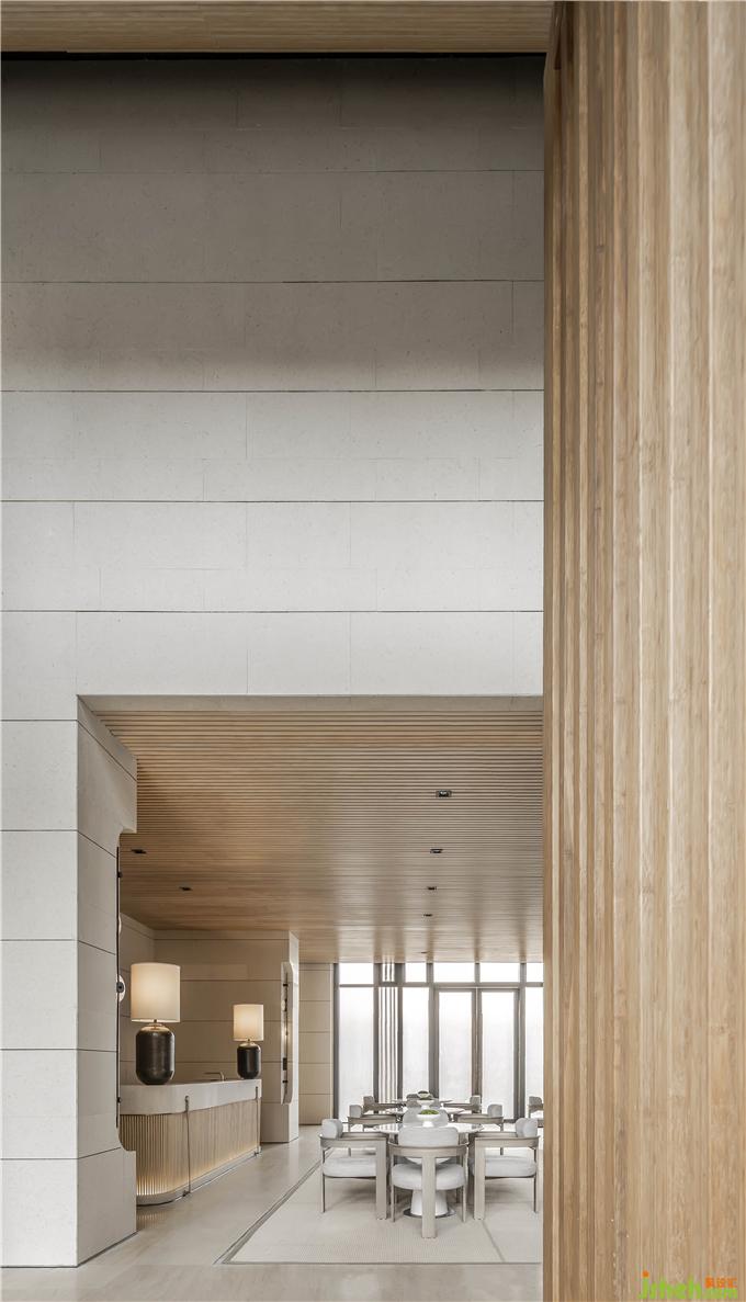 天花设计勾勒出斜屋顶梁构,让精神如入传统庙宇意象,呈现为风雅利落的现代骨干式建筑。长木为隔栅,遍布天花立面间,于无形中拉长空间的高度与深邃,放大场面气势。售楼处设计