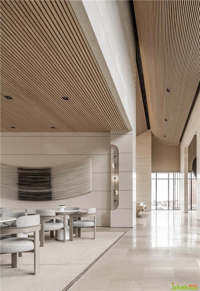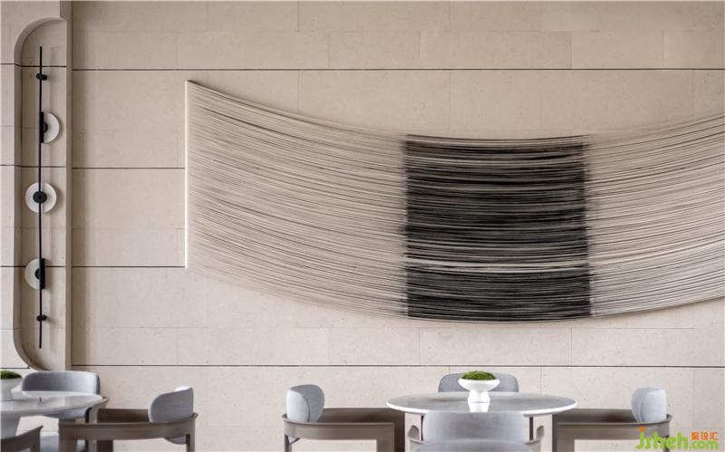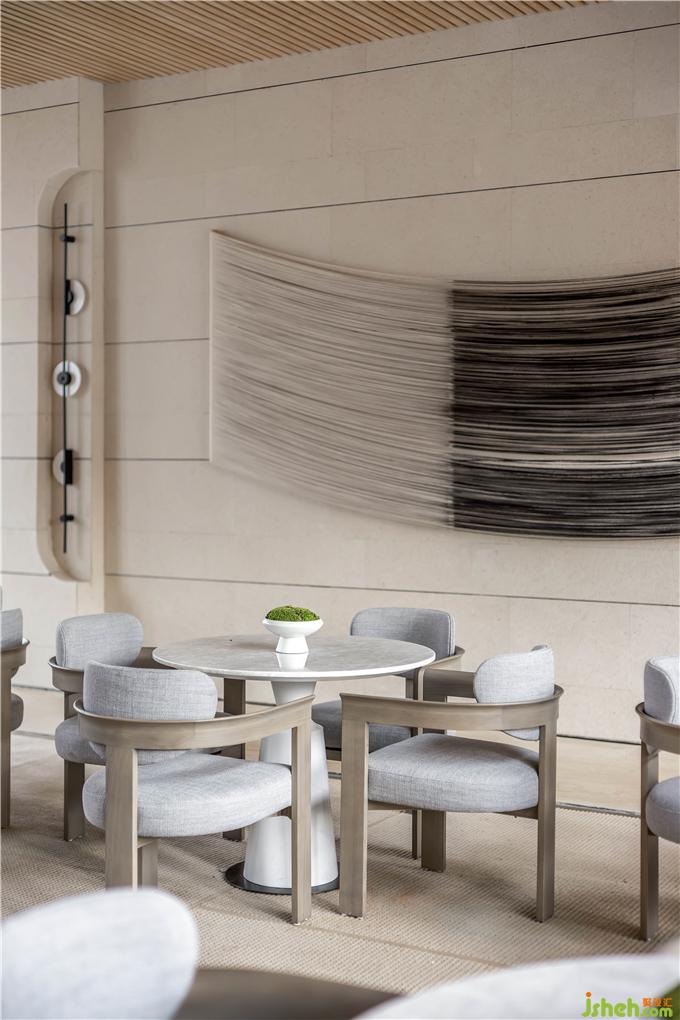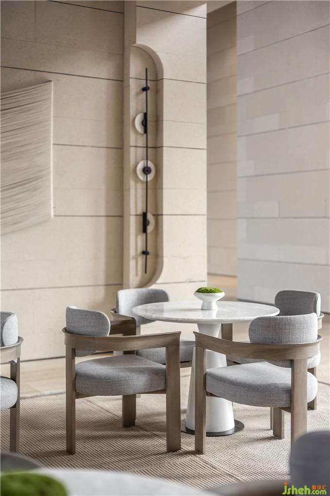 洽谈区的设计主题围绕圆与弧。舒适的区域,一场域,四面景,透视窗外,看穿门外,于洽谈品茗间观画里的美好弧度。虽是室内空间,但走开放式格局,空间不受局促,充满开放的轻松感。微尘在格栅间飘散,像是沙漏里流失的时间,点点滴滴,像是在诉说着世间因果。