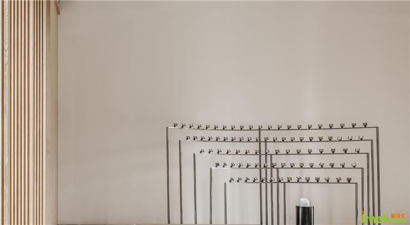 洽谈区天花板木栏栅设计,以视觉界定空间焦点,隔栅直线无形延伸了空间宽度,也延伸出空间的优越。洽谈椅有巧妙的圆弧扶手,恰与墙面抽象画成圆弧协调姿态,象征微笑拥抱以及佛家笑对人生,知足常乐的人生态度。
