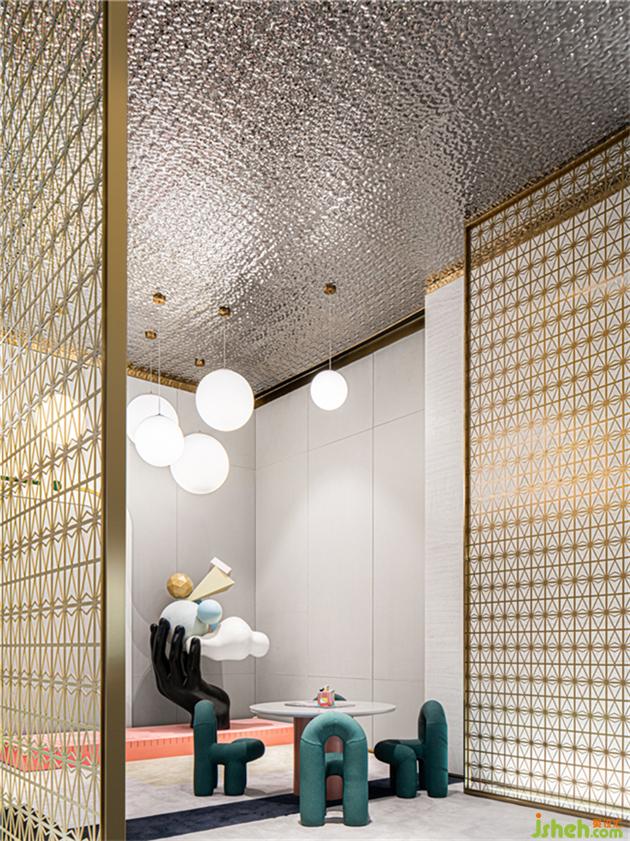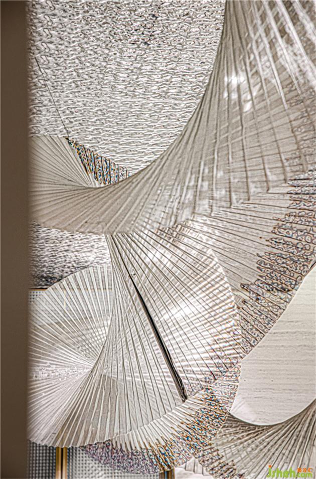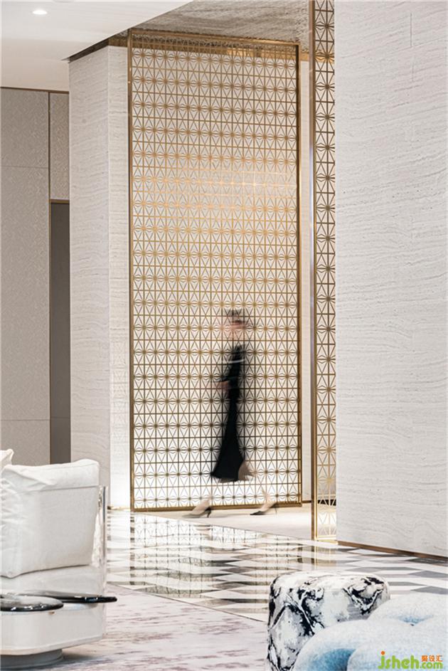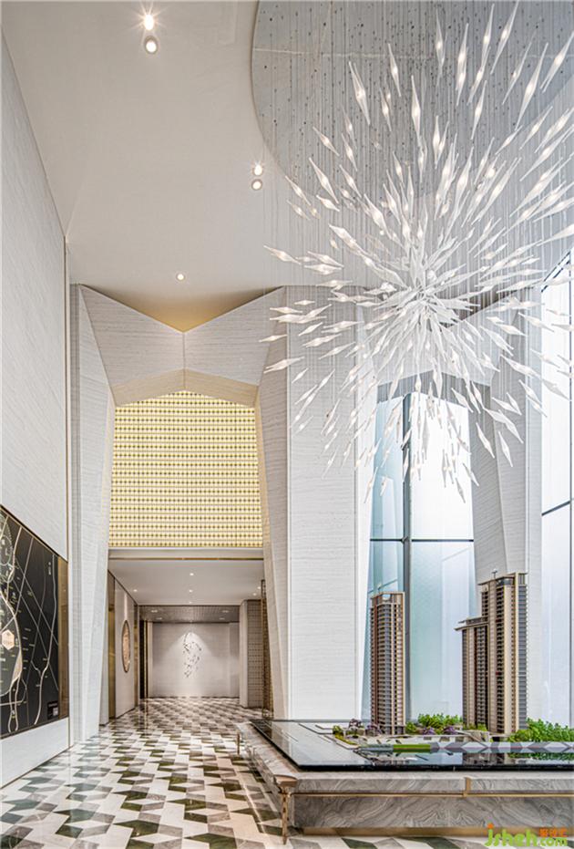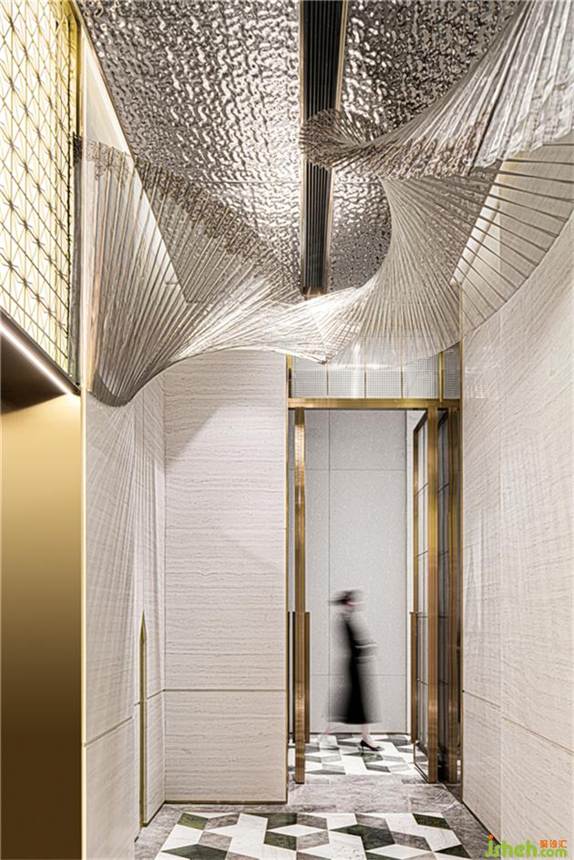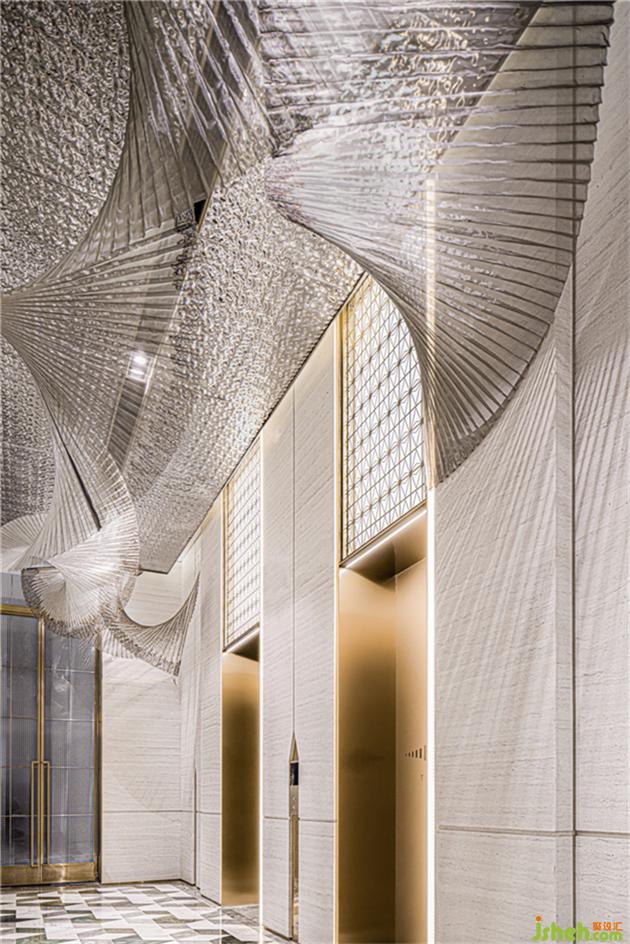 设计师从珠宝的星芒撷取设计元素,将钻石的几何切割和光辉反射通过抽象化处理,融入到室内空间的材质及形态中。电梯厅虽为暗空间,通过顶面水波纹板的材质以及整个艺术天花的光影增加层次,增大了空间的视觉张力。售楼处设计