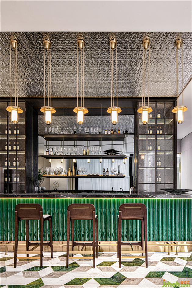 设计师在空间里通过镜面反射以及光影的表达来增强空间的艺术调性,象征珠宝坚固、闪耀、恒久远的特性。色调呼应主题选用宝石翡翠的绿色作为整体空间的主题色,将室外景观最大限度地带入室内,突破建筑位于地下层的空间局限性,进而予人沉稳舒心的空间感受。