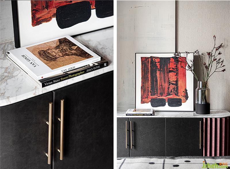落地窗柔和地迎入暖阳,和暖色调的木系家具共同营造温馨感。红色黑色的基础色调更加营造了主卧沉稳与内敛的气质,插花与画作提升了空间的艺术氛围。