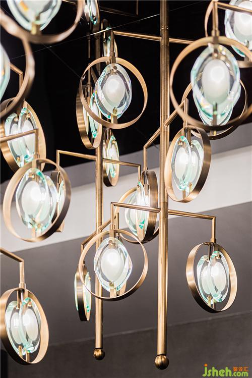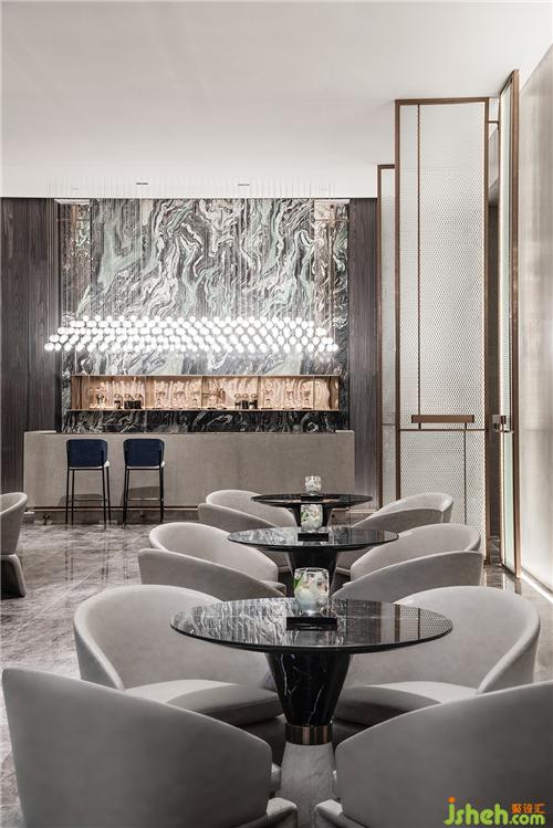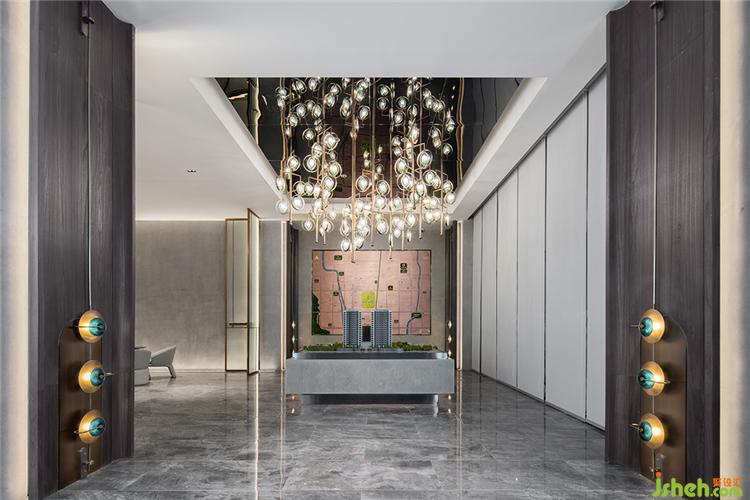 严谨规整的木门之后,沙盘区则是一派水光潋滟的幽静诗意。古铜金属与玻璃交错形成的巨型吊灯自天花垂下,暖黄的光晕淡雅柔和。装修设计