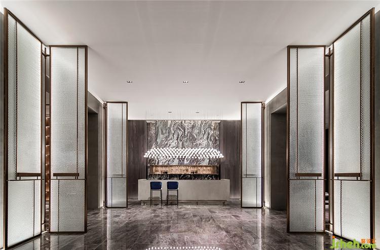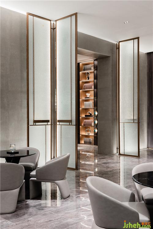 视线投向走廊尽头,两侧带有浮雕肌理的玻璃屏风将空间的视觉效果向两侧延伸。设计师使空间呈现出水晶宫般的剔透,令区域的分割、空间的体验上也生出一种壮阔与气韵。