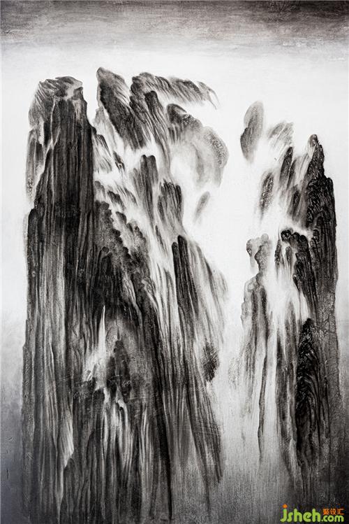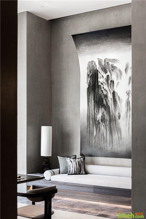 灰色墙面之上,悬挂着一幅意境朦胧又有气势的山水画。画卷上端微微翘起,增添了一丝虚实交融的气息,仿佛有山间微风拂过窗棂,轻轻吹起白色窗帘,于是景色也便在这其中,微微摇动。