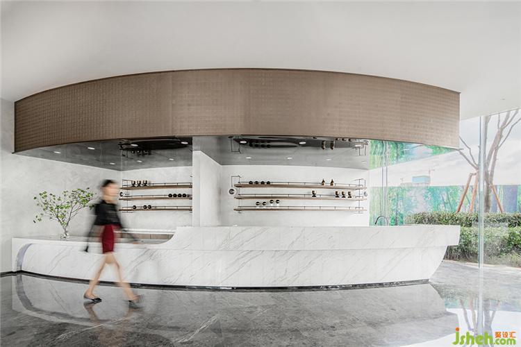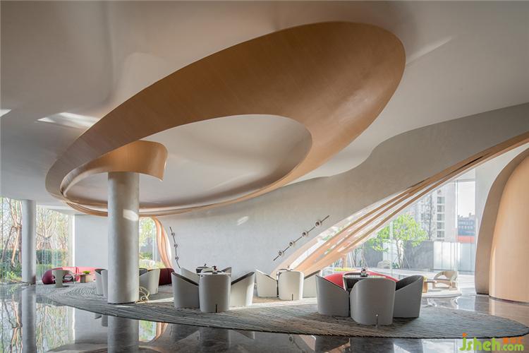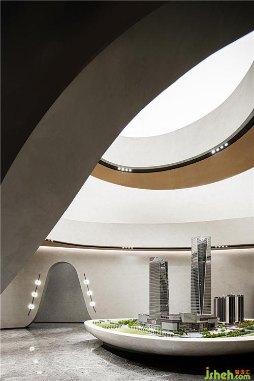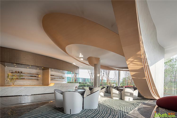 几经流转,景色豁然开朗,视野延伸至更开阔的境地,观者在此完成心境的转换。洽谈区顶端延续沙盘区的手法,增添了板材的使用。