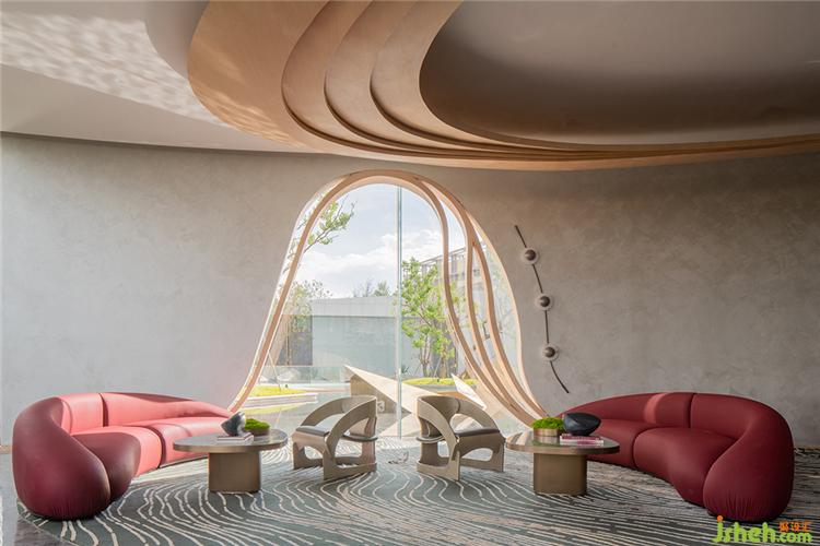 沙发区与洽谈区之间以块毯来划分界限,半开半合,让开敞的交谈渐渐转入舒缓的节奏。大范围使用落地窗,通透的格局模糊了室内外边界,打造出亲近自然、富有温度的美学社区。