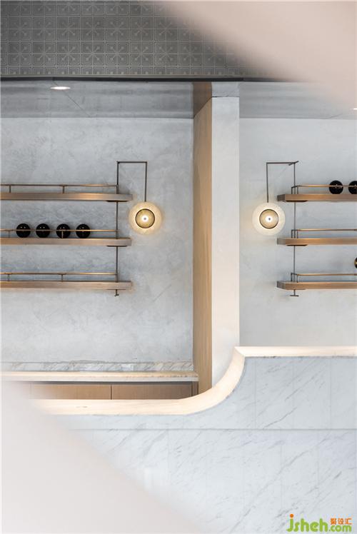 设计师借鉴现代美术馆的设计手法,通过点、线、面的交错与构成来表达空间的形态。圆形壁灯如明珠悬于墙上,与线条流畅的拱门与安谧的灰色墙面相衬,为整个空间笼罩了一层柔润的光泽。