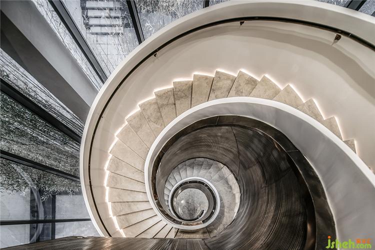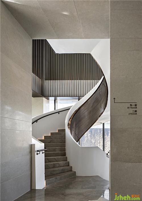 不同视角下,楼梯的线性之美尽显无疑。影影绰绰中,犹如山间小径蜿蜒而下,似动非动,安然而飘逸。