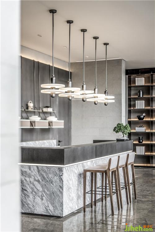 水吧延续简洁质感,质感的大理石与温暖木材的配色,浓度不同的灰色变化出丰富的层次感,协调出一个有温度又精巧的空间,营造出一种经岁月沉淀的慵懒与淡然。