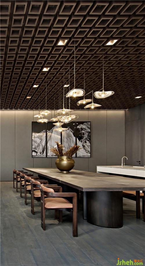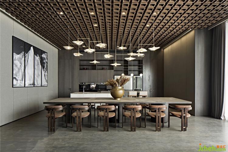 起伏的曲线灯具捕捉了水波纹的动态,让温和的光影覆盖其室,有着空中流水之感,增添了空间的灵动与优雅。