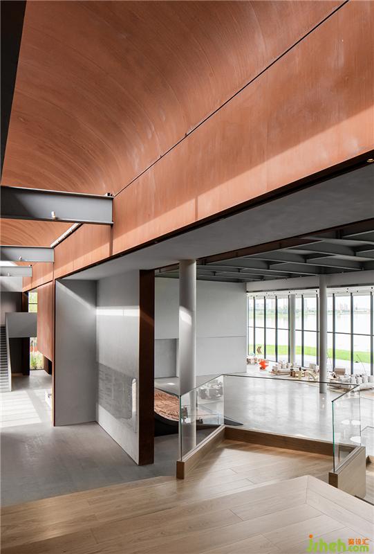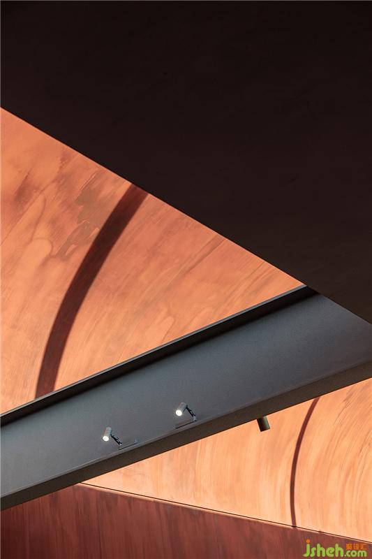 空间的色彩关系在简洁的形体中显得更为突出。深色的横梁与暖色的弧形天花形成了色彩的对撞,创造出了一个宁静而厚重的室内装修设计空间。