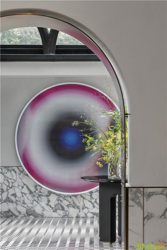 前厅悬挂着艺术家颜磊的作品《彩轮》,⾊彩和明暗关系中的递进与回旋,让人泛起跃跃欲试的窥探欲,吸引着住客步入神秘的内部空间。