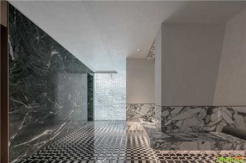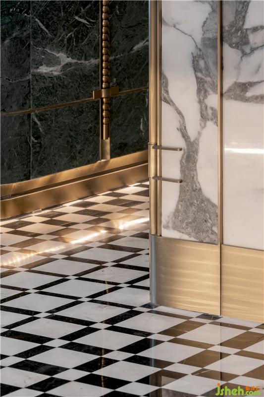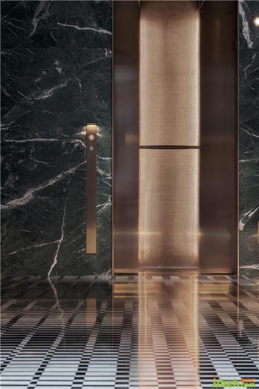 灯光映射在电梯门上,经过地面的反射,巧妙地拓展了空间的向度。琥珀灯光与墨绿色的墙面和谐统一起来,别有一番绚丽风情。