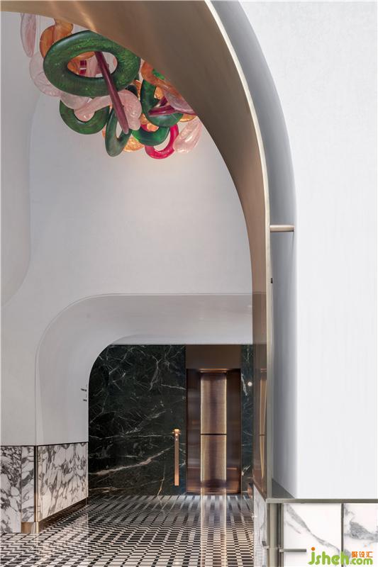 前厅由数条弧形曲线组成,将老上海的石库门以抽象的形式描摹出来,以现代形式诠释底蕴丰厚的本土建筑符号。